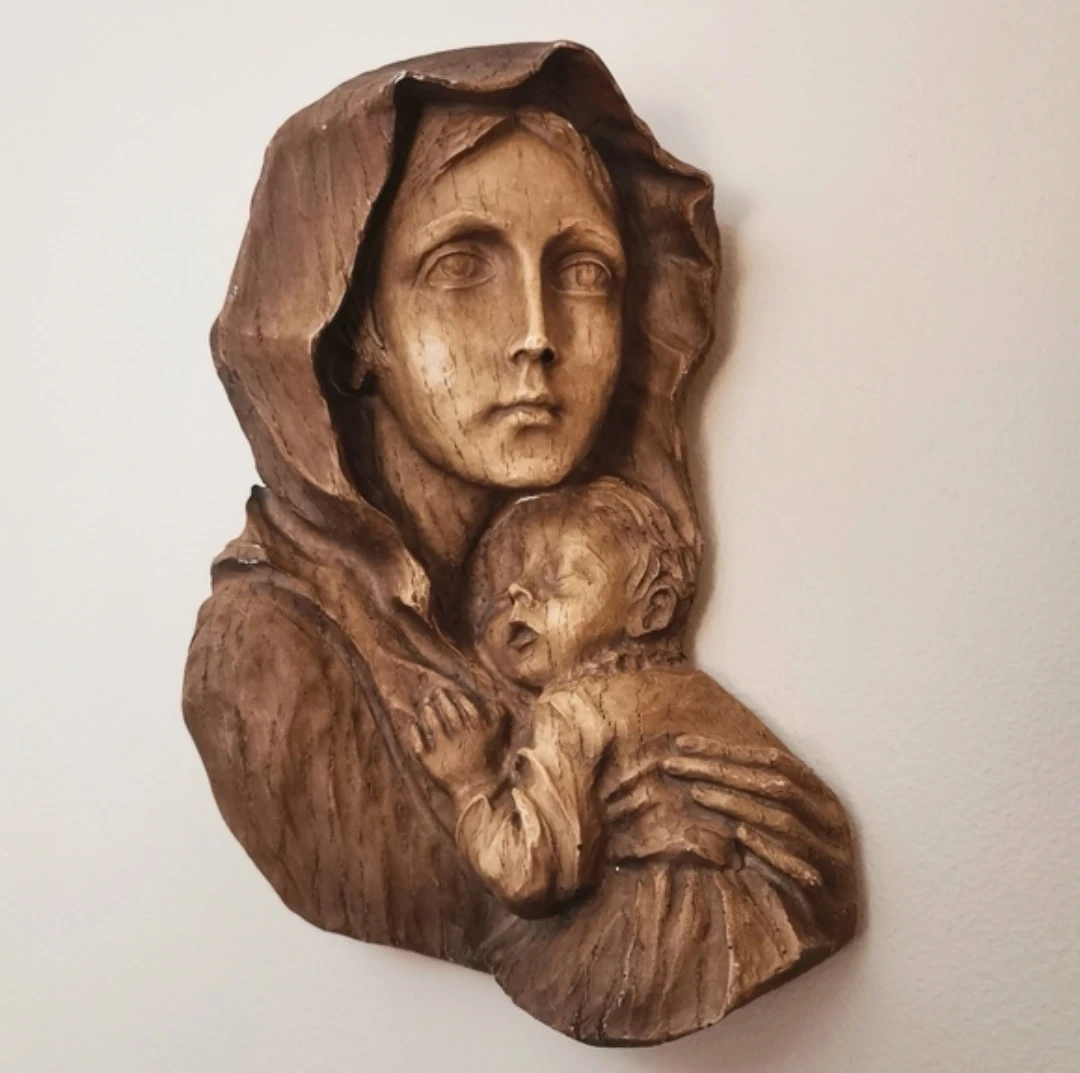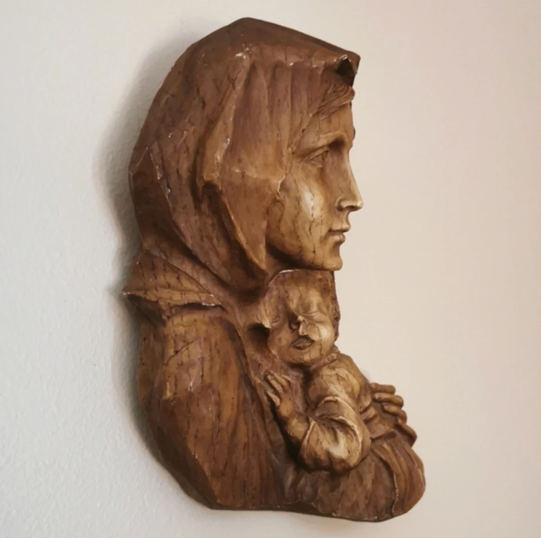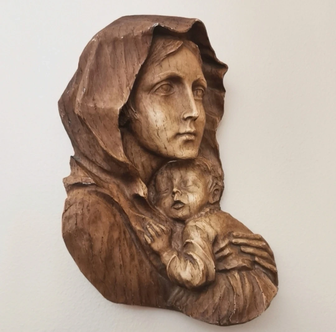 Beautiful vintage hand-carved Madonna and Child wall plaque, featuring a serene depiction of the Virgin Mary holding baby Jesus. This piece showcases intricate detailing, expressive facial features, and a warm rustic patina that adds to its timeless charm.
