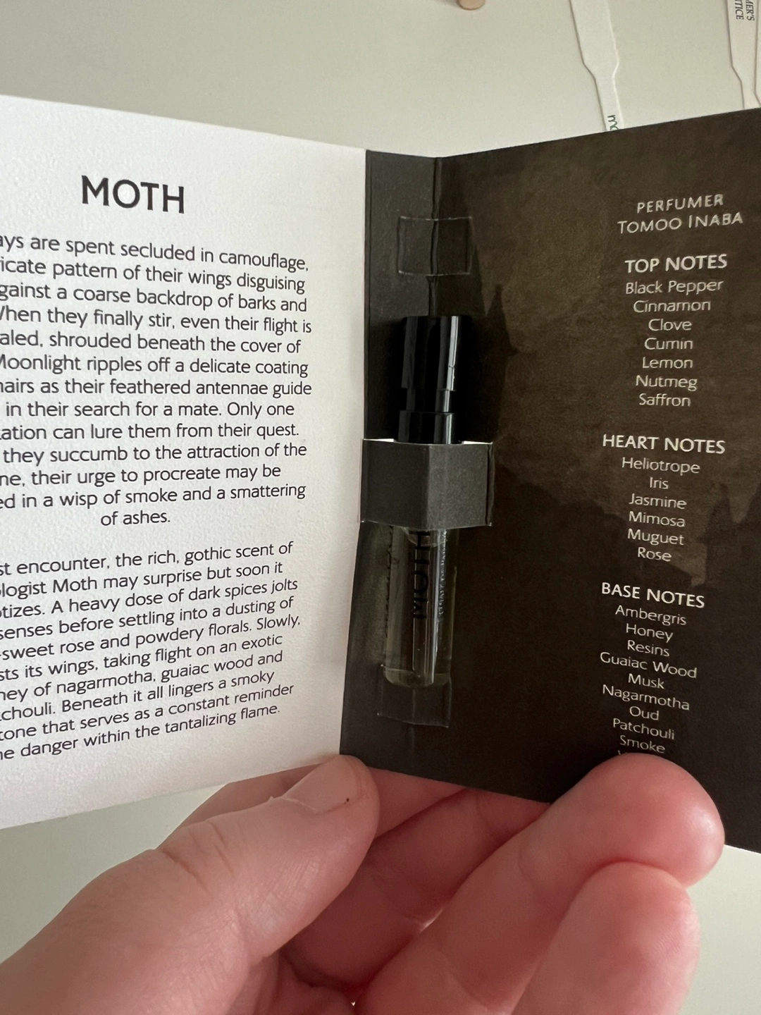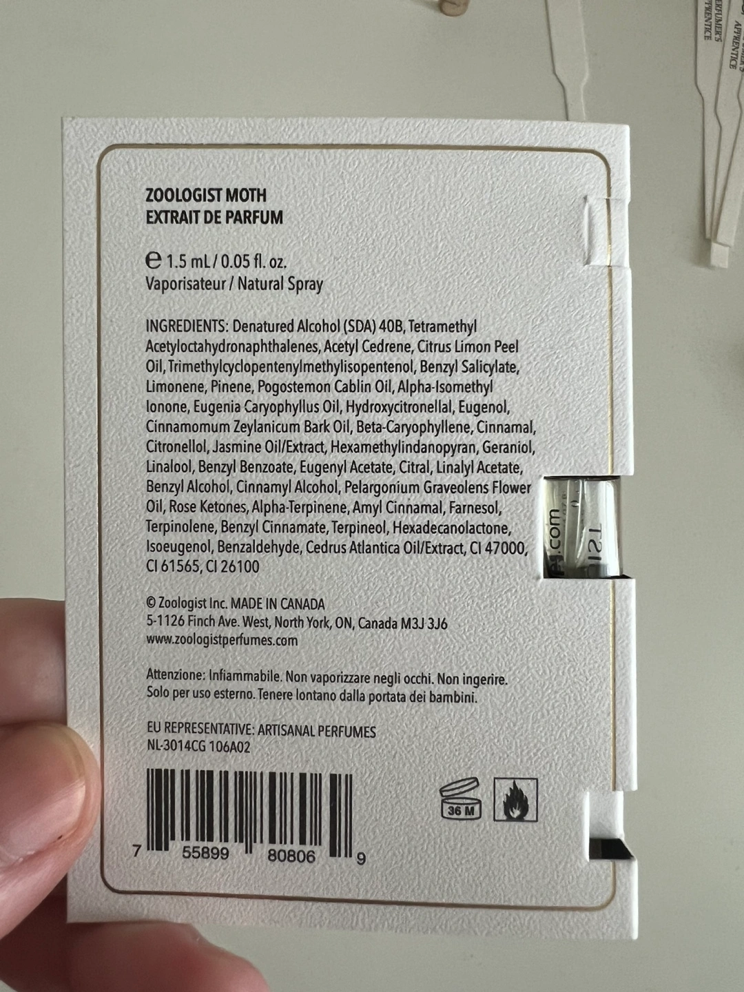 Zoologist Moth perfume sample. Includes a small spray bottle and detailed scent description card. Pickup in Richmond Hill near Bathurst and Gamble.