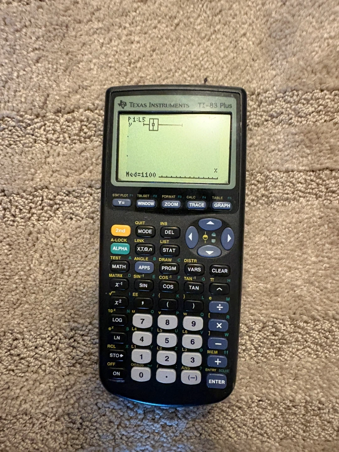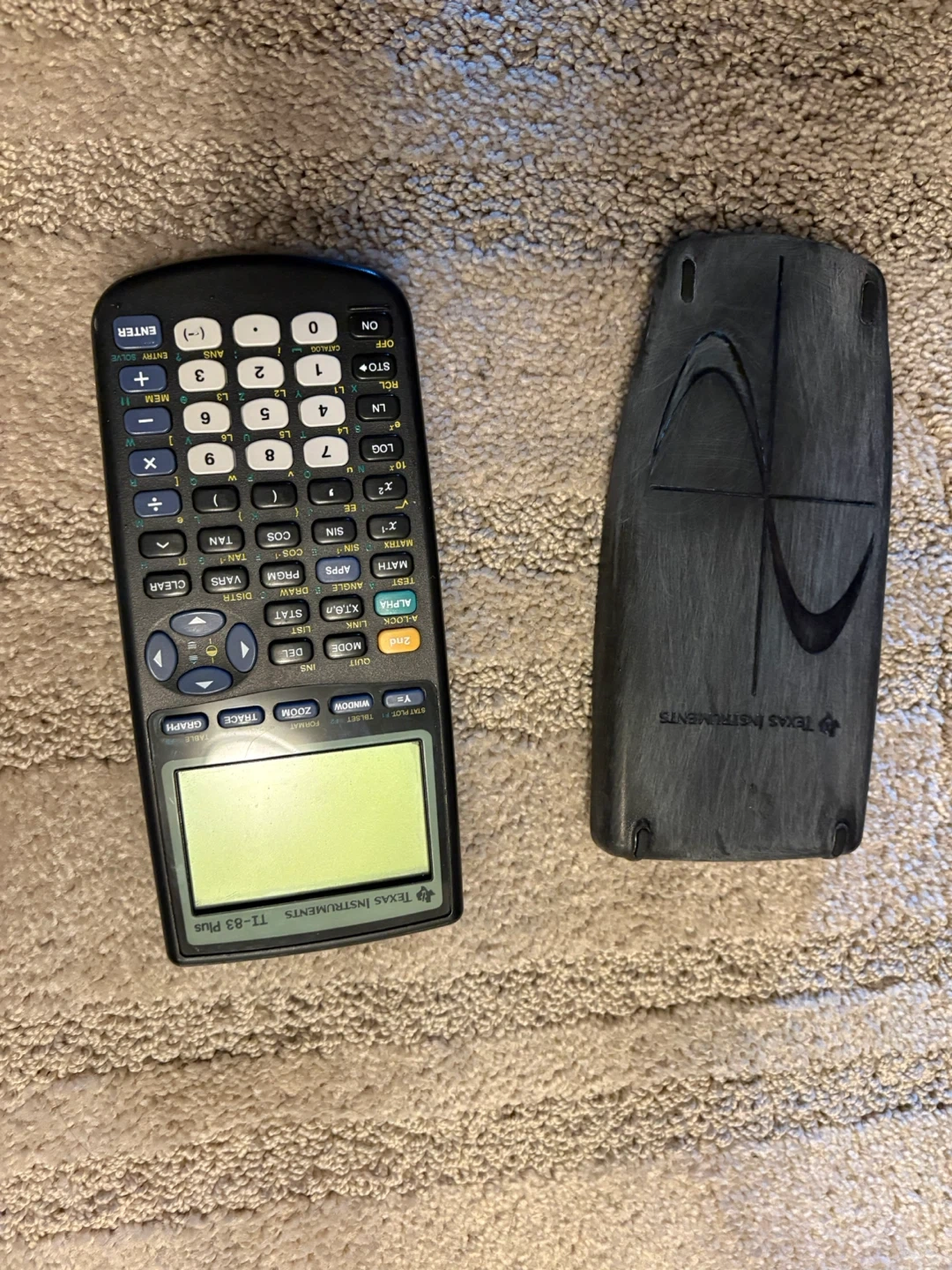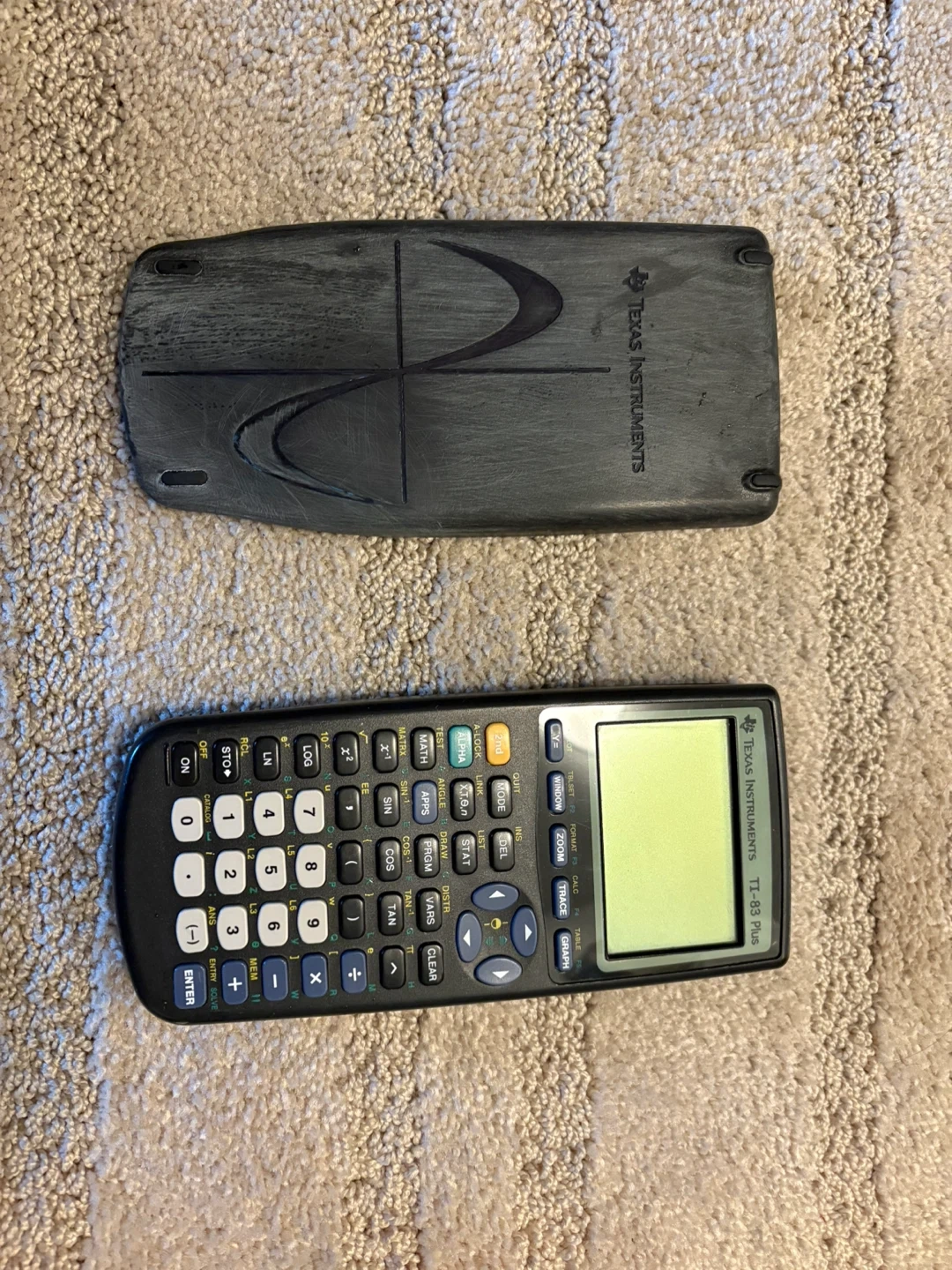 This is a Texas Instruments TI-83 Plus graphing calculator. It includes a protective slide cover. This calculator's functionality is great for high school and college math and science courses.