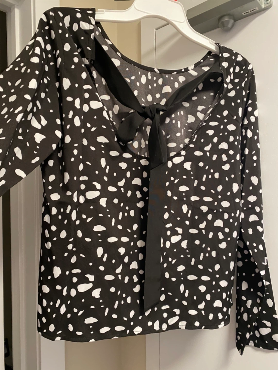 This long-sleeved fancy blouse features a black and white speckled print. It has a tie detail at the back neckline for a stylish touch. Material is lightweight and flows nicely.