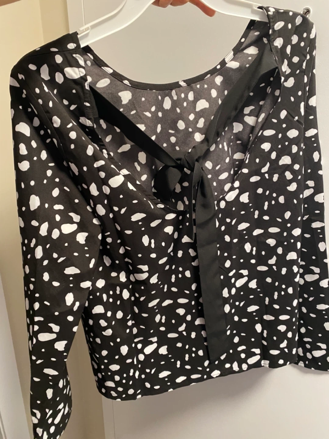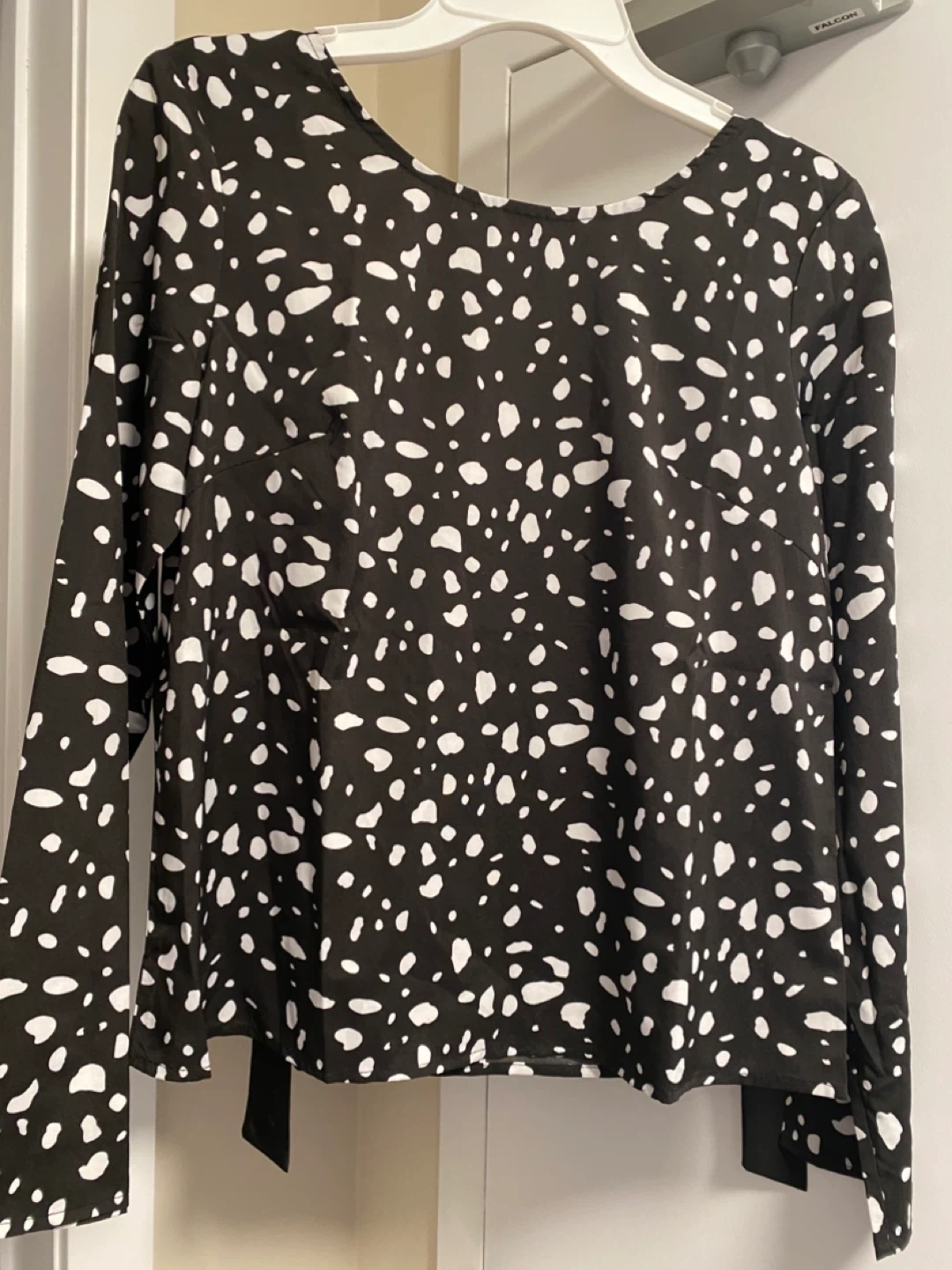 This long-sleeved fancy blouse features a black and white speckled print. It has a tie detail at the back neckline for a stylish touch. Material is lightweight and flows nicely.
