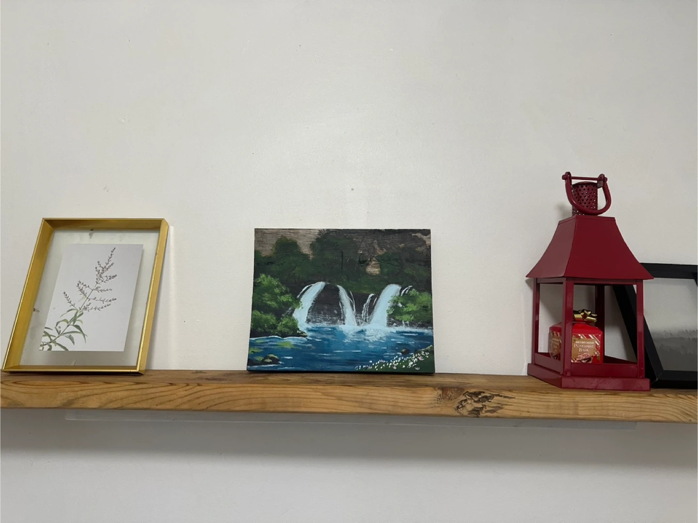 This is a unique hand-painted piece of art featuring a serene waterfall scene. It's painted on a piece of wood, giving it a rustic charm.