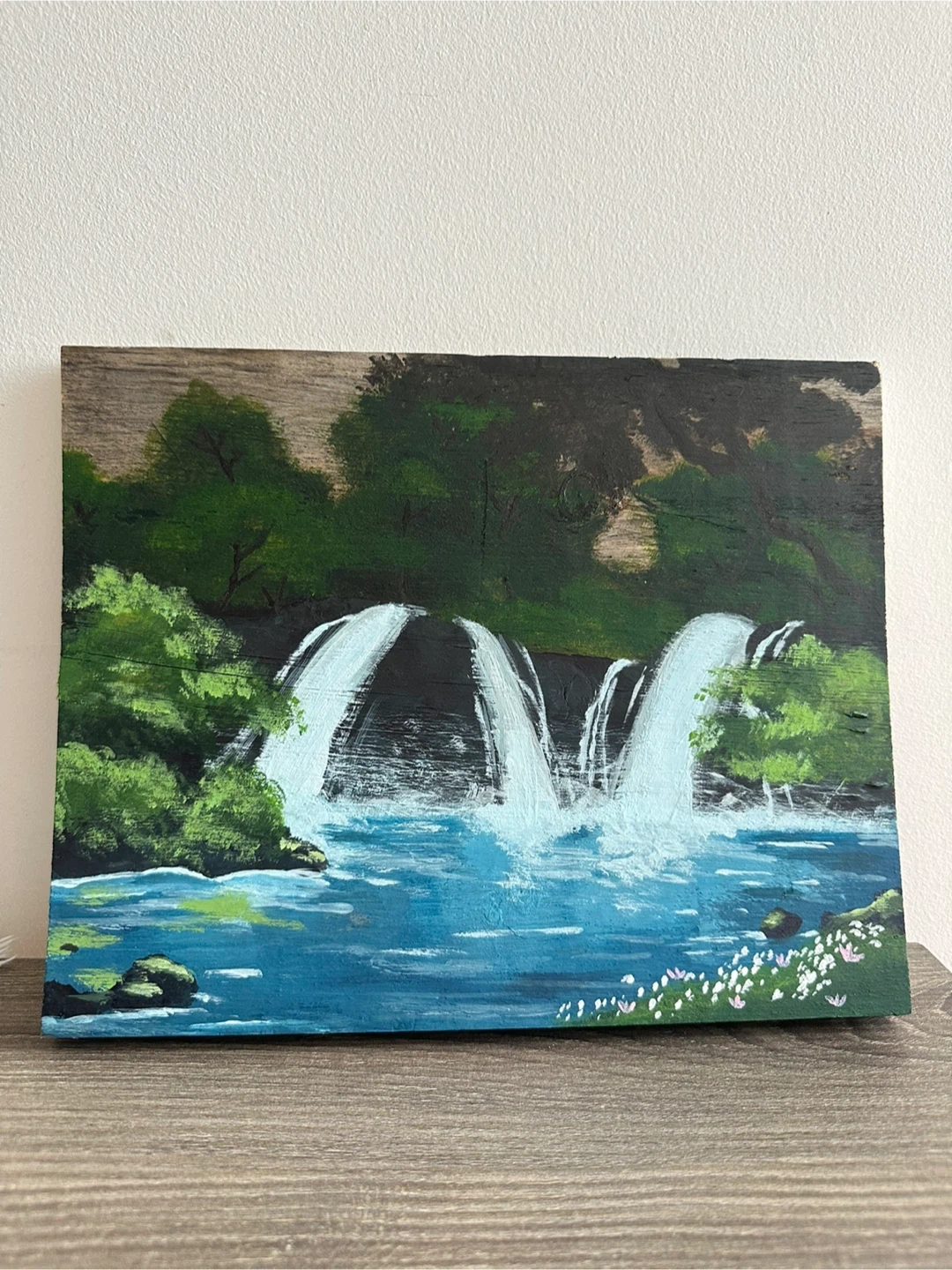 This is a unique hand-painted piece of art featuring a serene waterfall scene. It's painted on a piece of wood, giving it a rustic charm.