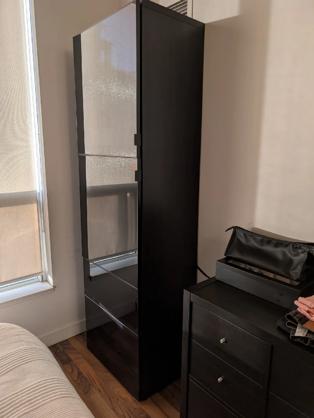 Here's a sleek black armoire cabinet that would look great in any room. It features glass doors and plenty of storage space. Perfect for organizing clothes, accessories, or anything else you need to keep tidy. It's in great condition and ready for a new home.