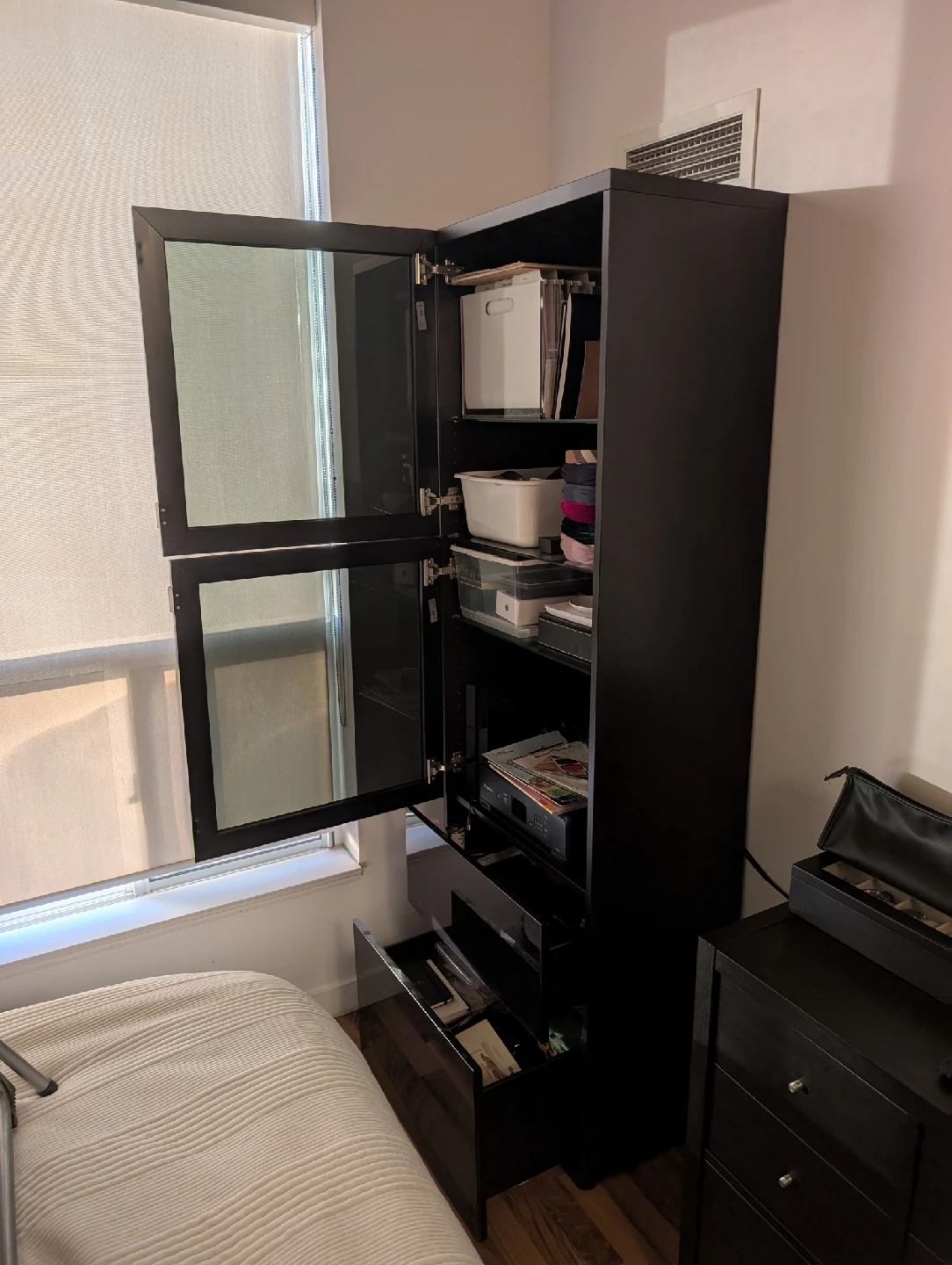 Here's a sleek black armoire cabinet that would look great in any room. It features glass doors and plenty of storage space. Perfect for organizing clothes, accessories, or anything else you need to keep tidy. It's in great condition and ready for a new home.