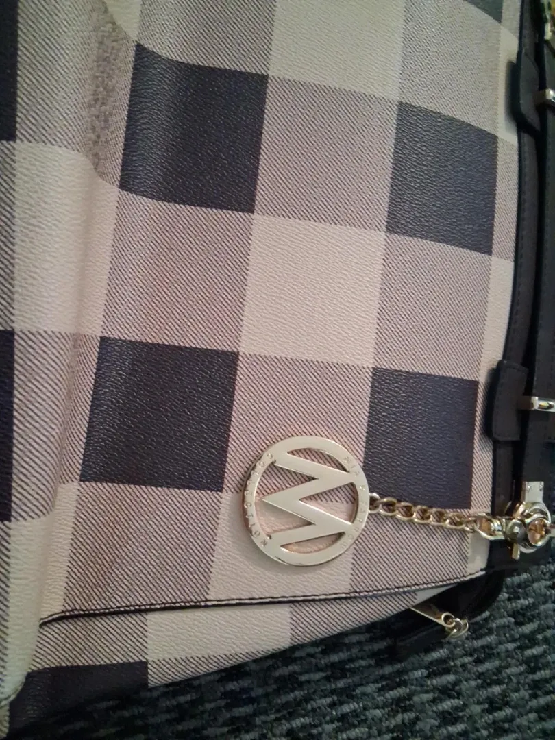 This is an MCM handbag in a classic plaid pattern. It features a gold-tone logo charm and chain accent. It's a stylish accessory for everyday use.
