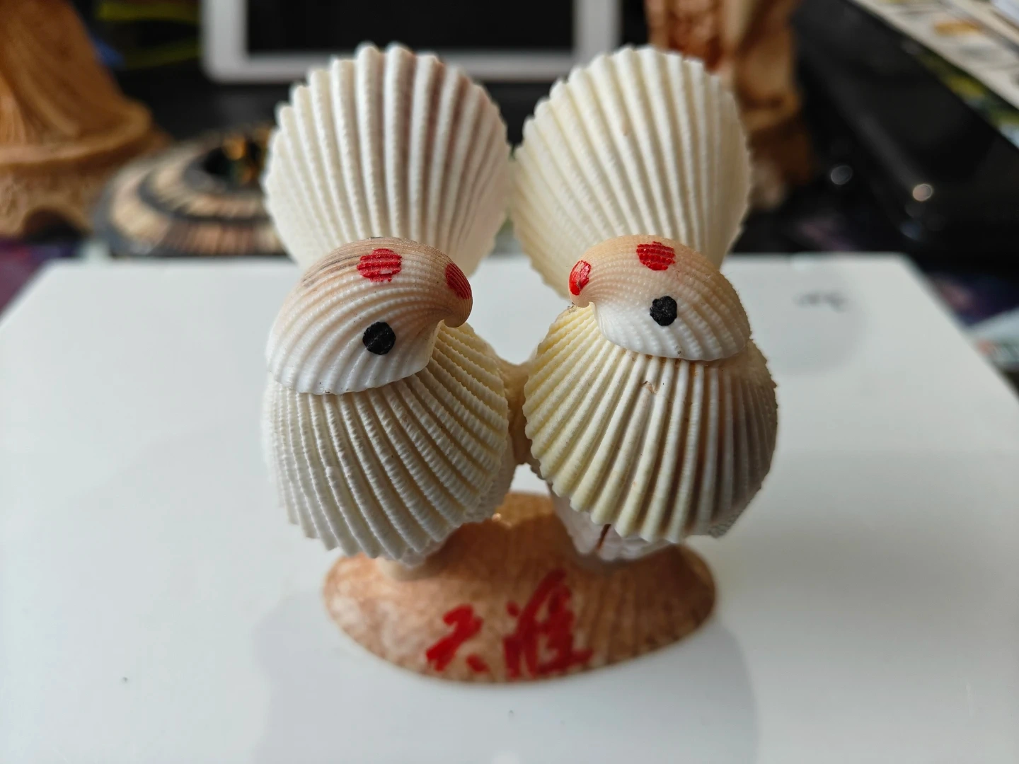 This is a charming decorative figurine made from seashells, crafted to resemble two birds. It's a lovely piece for adding a coastal touch to any room. The base appears to have some red markings.