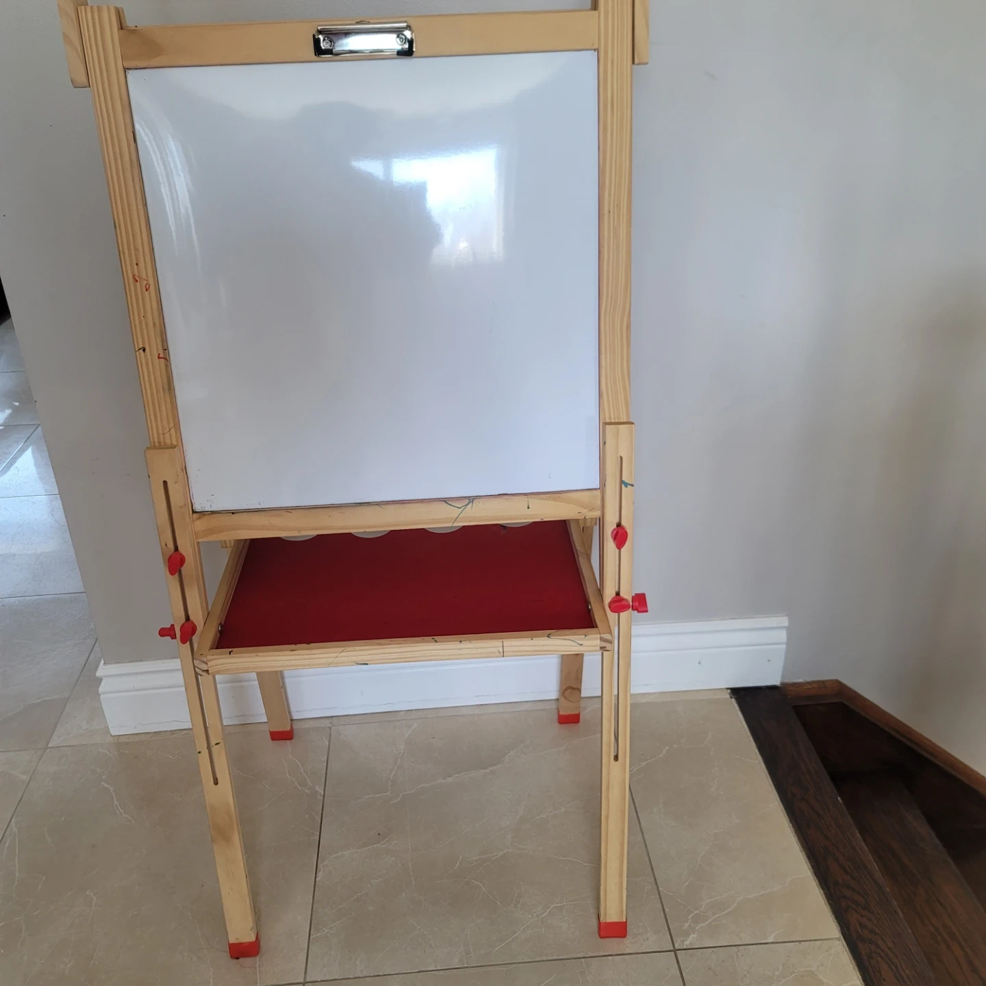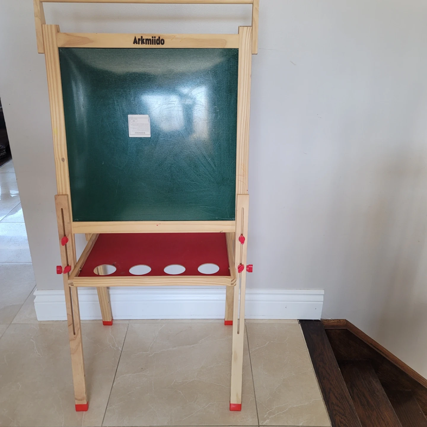 This easel has a dual-sided writing surface, featuring both a green chalkboard and a white dry-erase board. It's made of wood with adjustable height settings and includes a red tray for art supplies. Perfect for little artists learning to draw and write!