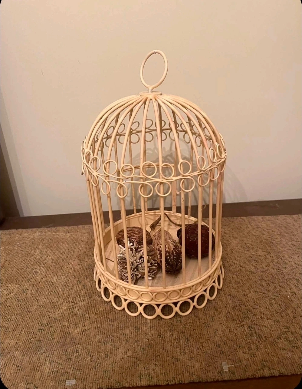 This decorative bird cage is made of a light-coloured metal with intricate detailing. It's a charming piece for home decor, suitable for mantels or side tables. It would make a lovely addition to a rustic or shabby chic style setting.