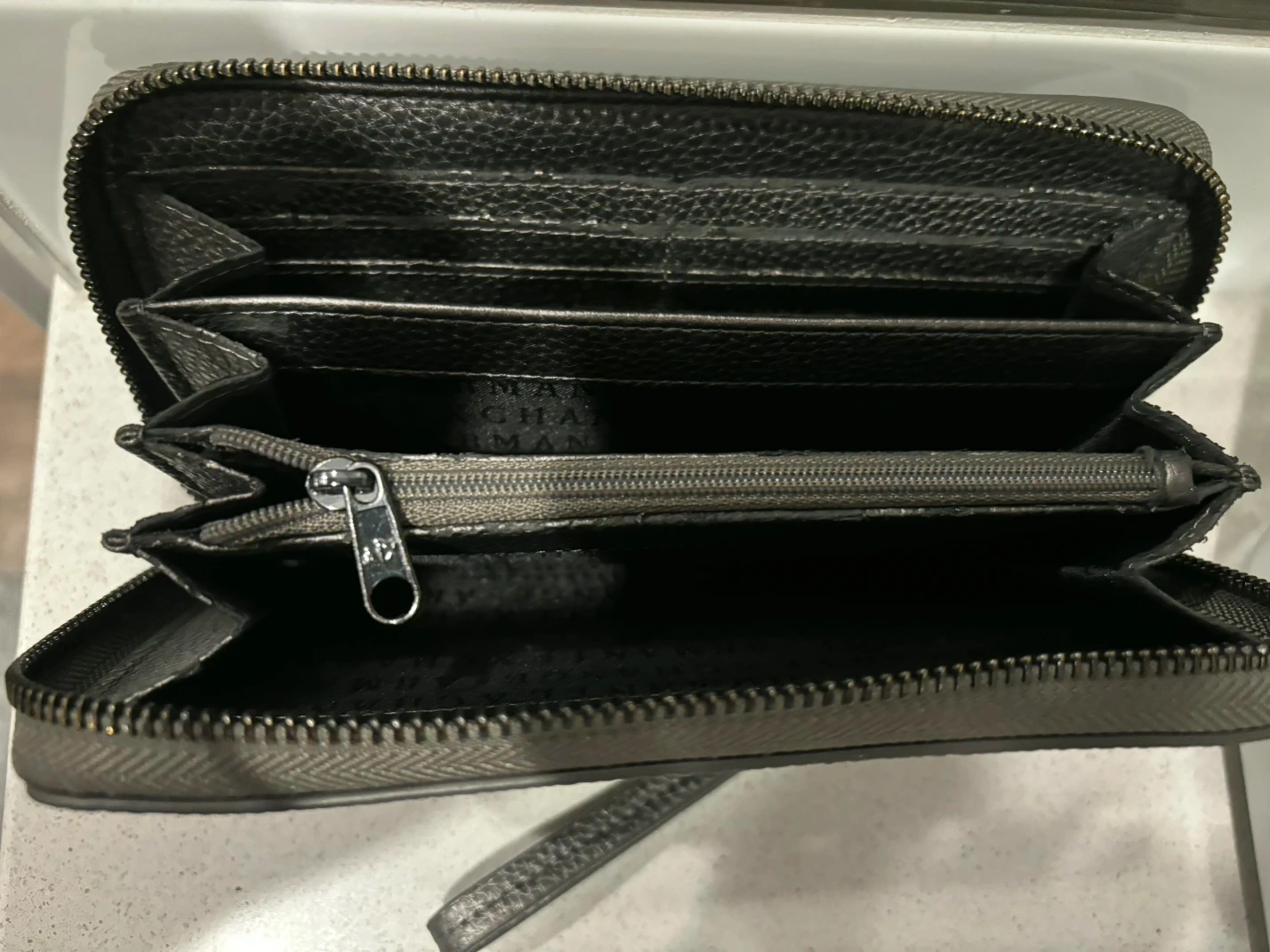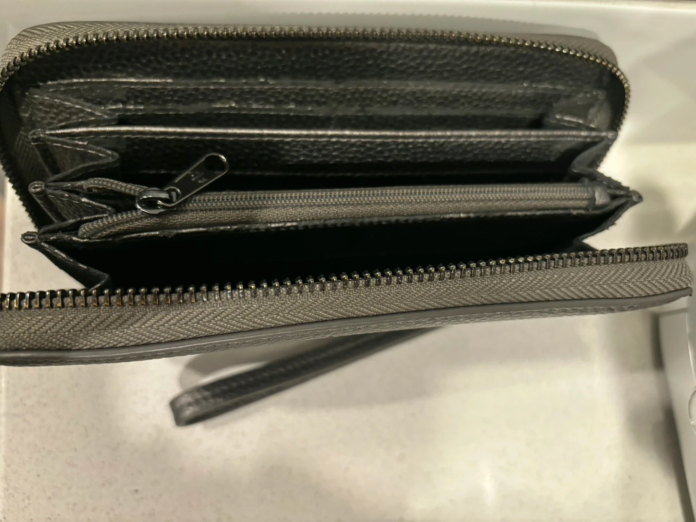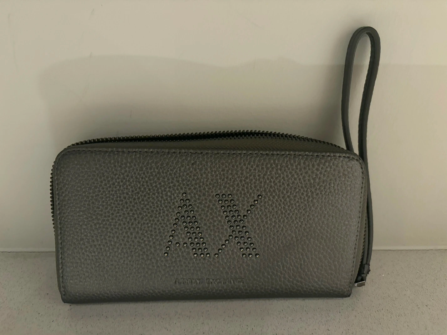 This is a grey Armani Exchange wristlet wallet. It's a zip-around style with multiple compartments inside. It has a pebble-grain texture and the AX logo with stud details.