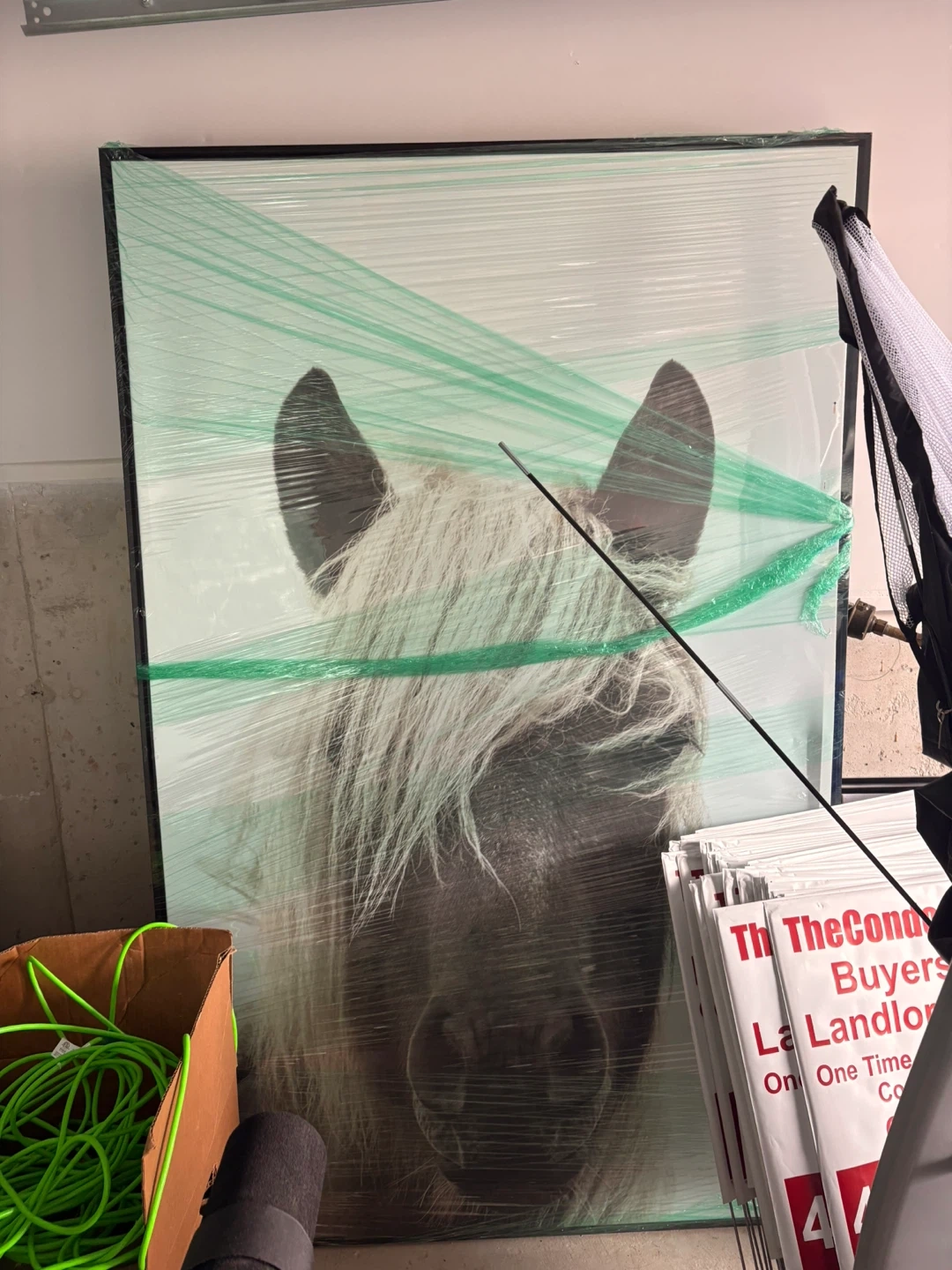 This large framed wall art features a close-up print of a horse's head. It's wrapped in protective plastic. Adds a striking equestrian touch to any room!