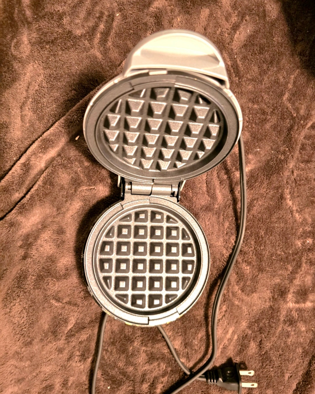 Small waffle maker, perfect for one. Includes a light that turns on when it is hot. Only used it a few times.