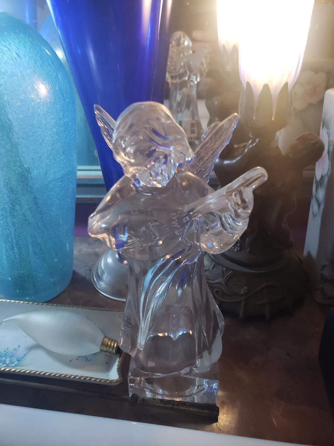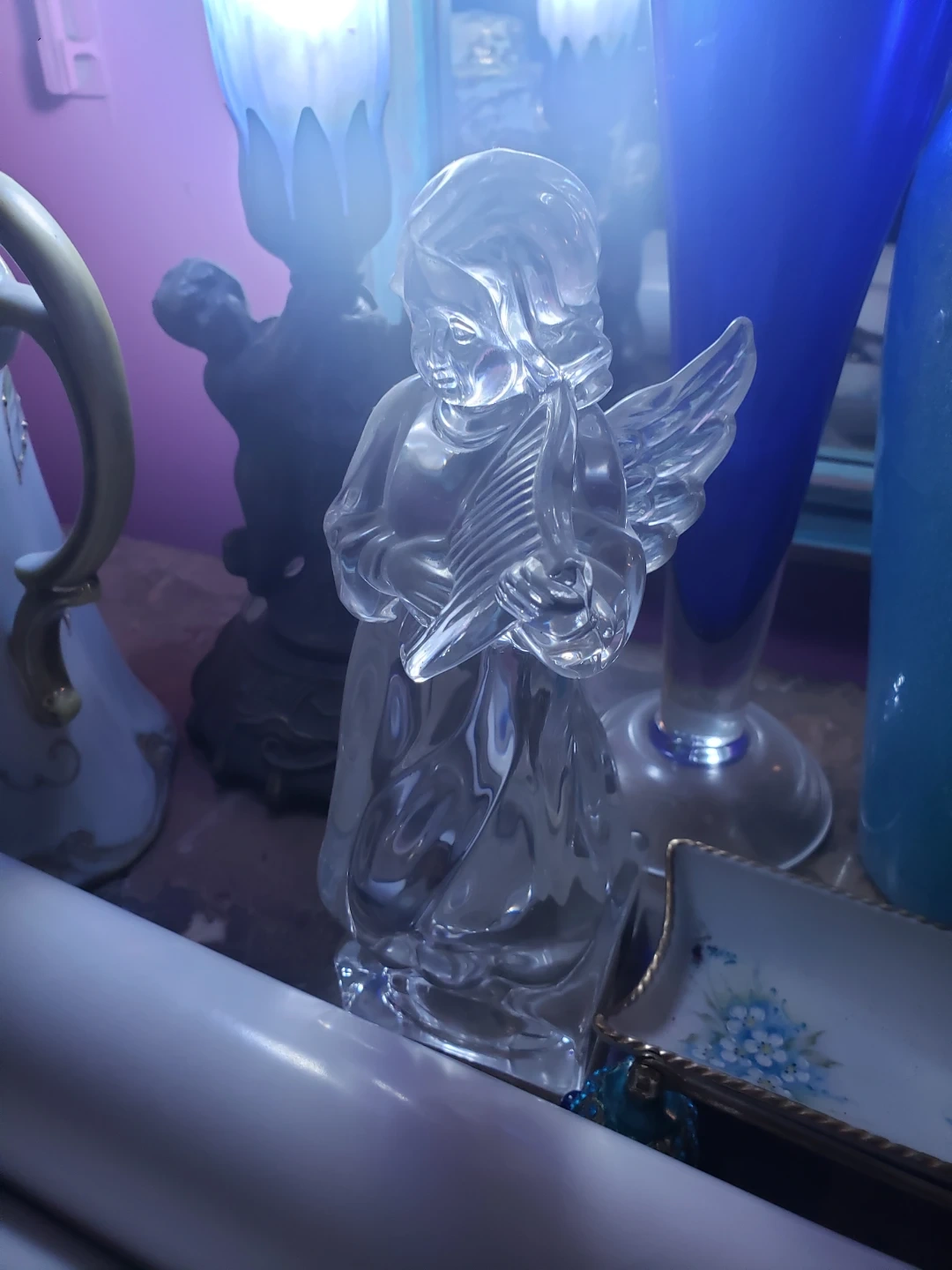Two glass figurines of an angel holding a lyre. It's a delicate piece, perfect for adding a touch of elegance to your home decor. The intricate details of the angel and the instrument are beautifully captured in the glass. 40$ for both