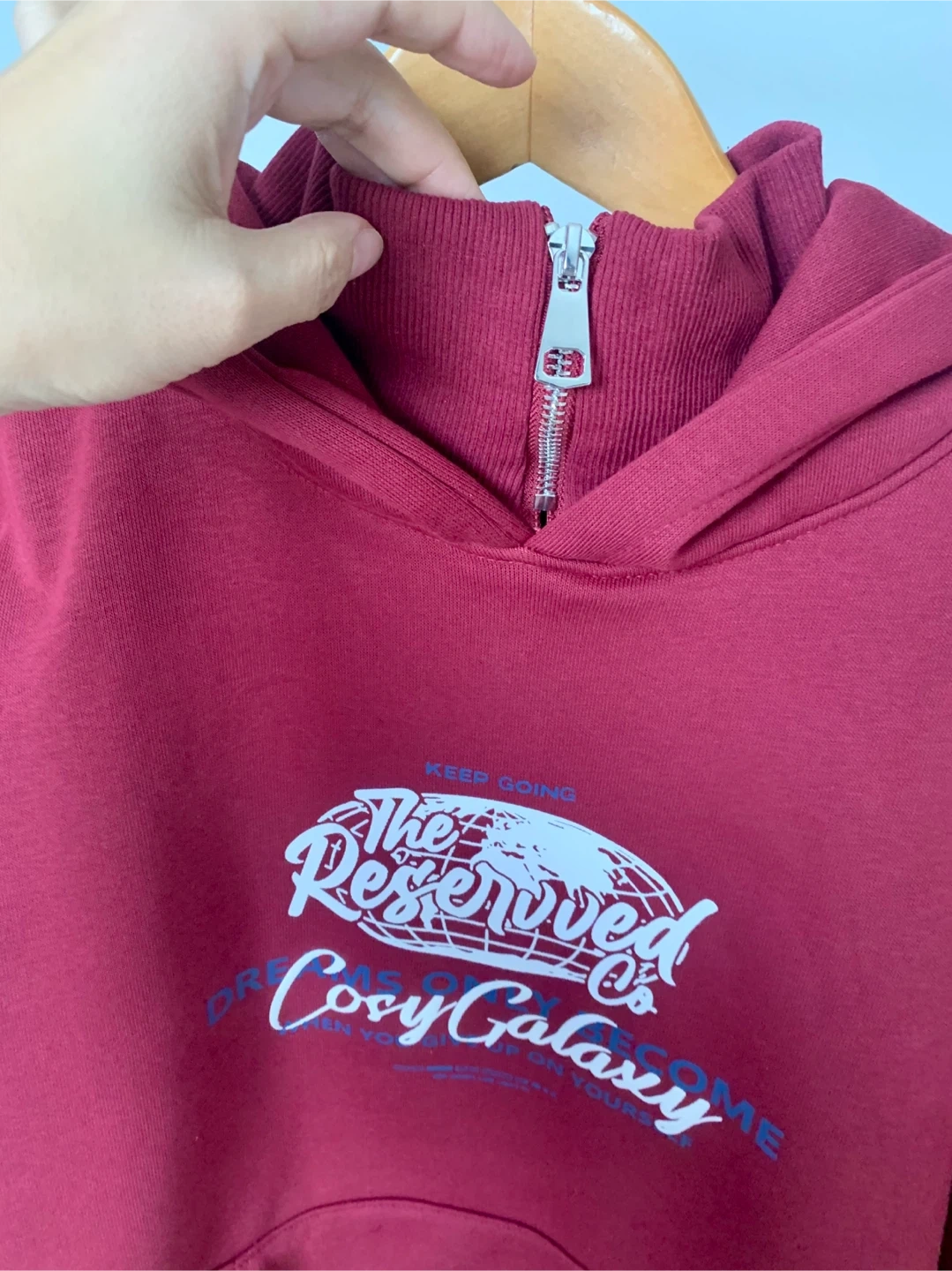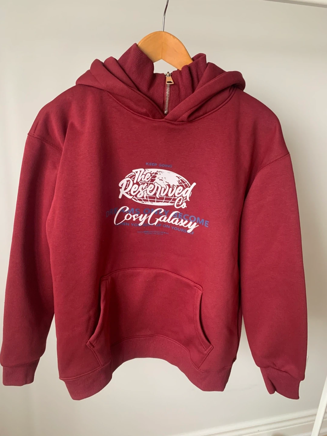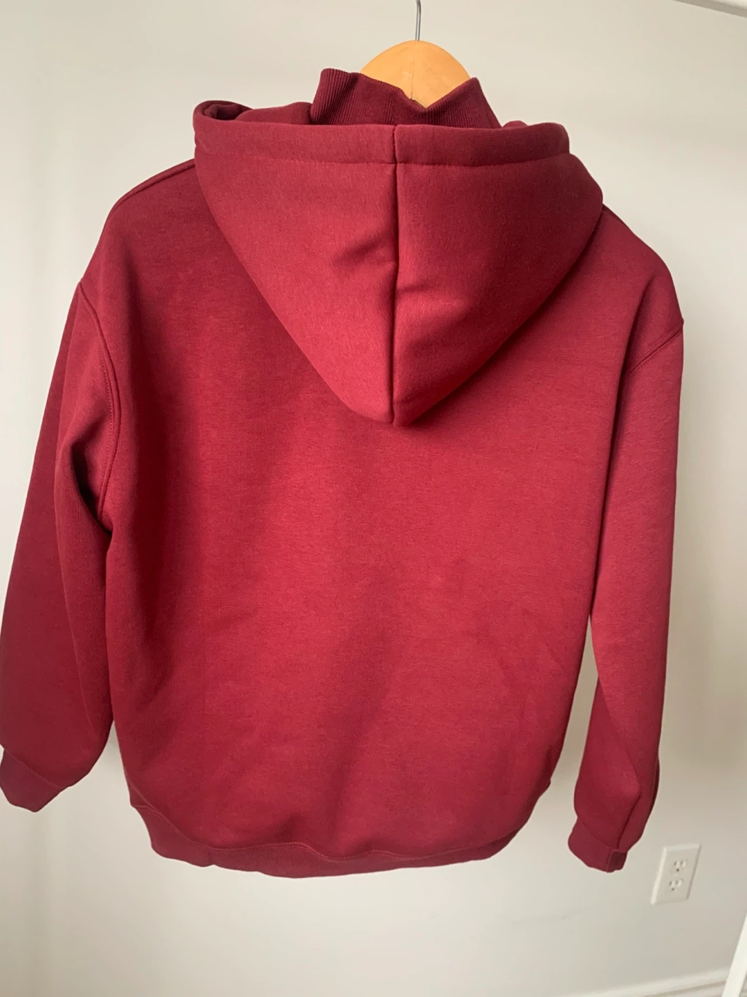 Brand new burgundy hoodie with tag. Very thick winter hoodie with heavy padded lining inside, much warmer than regular hoodies. High-neck design with zipper — collar can be zipped up for extra warmth. Perfect for cold weather, winter, and casual daily wear. Size: M (approx.) Measurements: Length 61 cm | Bust 108 cm Model is 5’6”, 125 lbs Photos show the actual item.