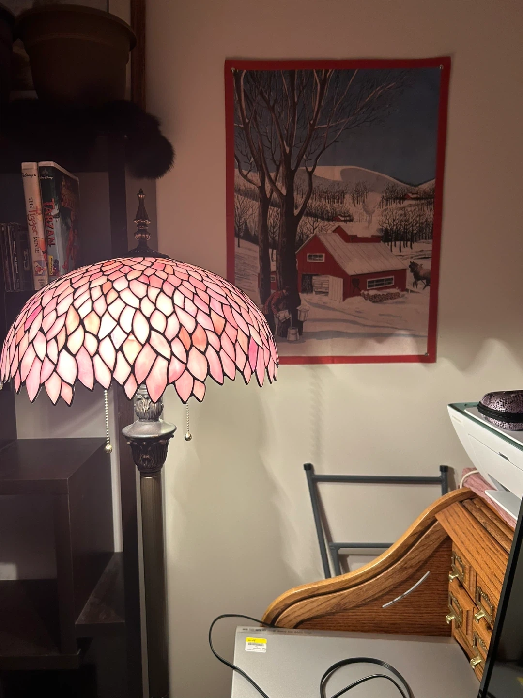 Brand new, open to offers, worth more then $400. A beautiful Tiffany style floor lamp with a decorative pink shade. It's perfect for adding a warm ambiance to any room. The lamp features a pull-chain for easy operation.