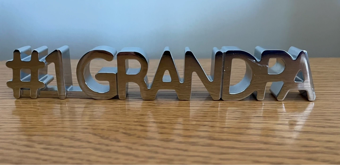 This metal desk sign proudly displays "#1 Grandpa". It's made of a shiny, silver-toned metal. A great desk accessory for any grandfather!
