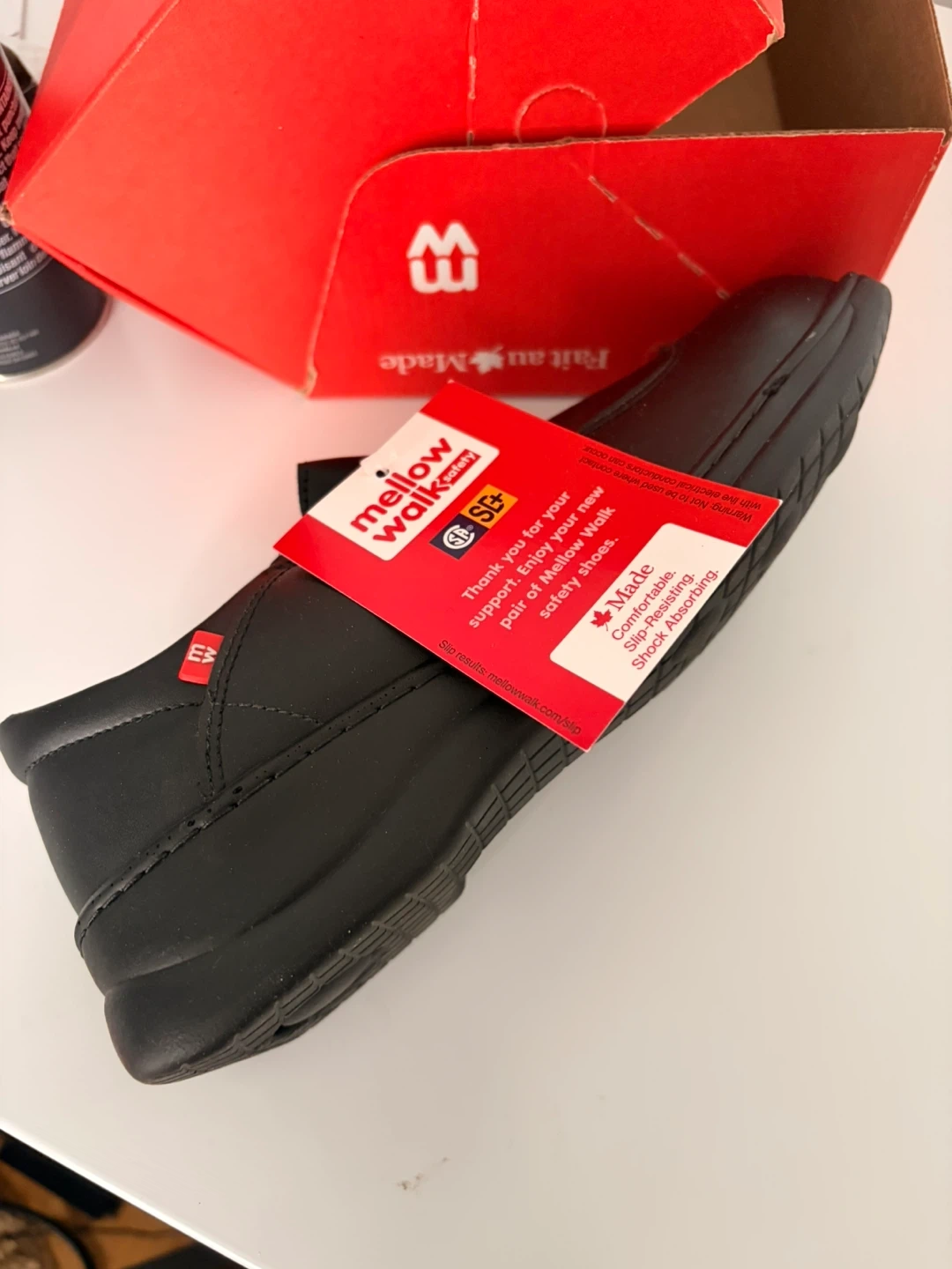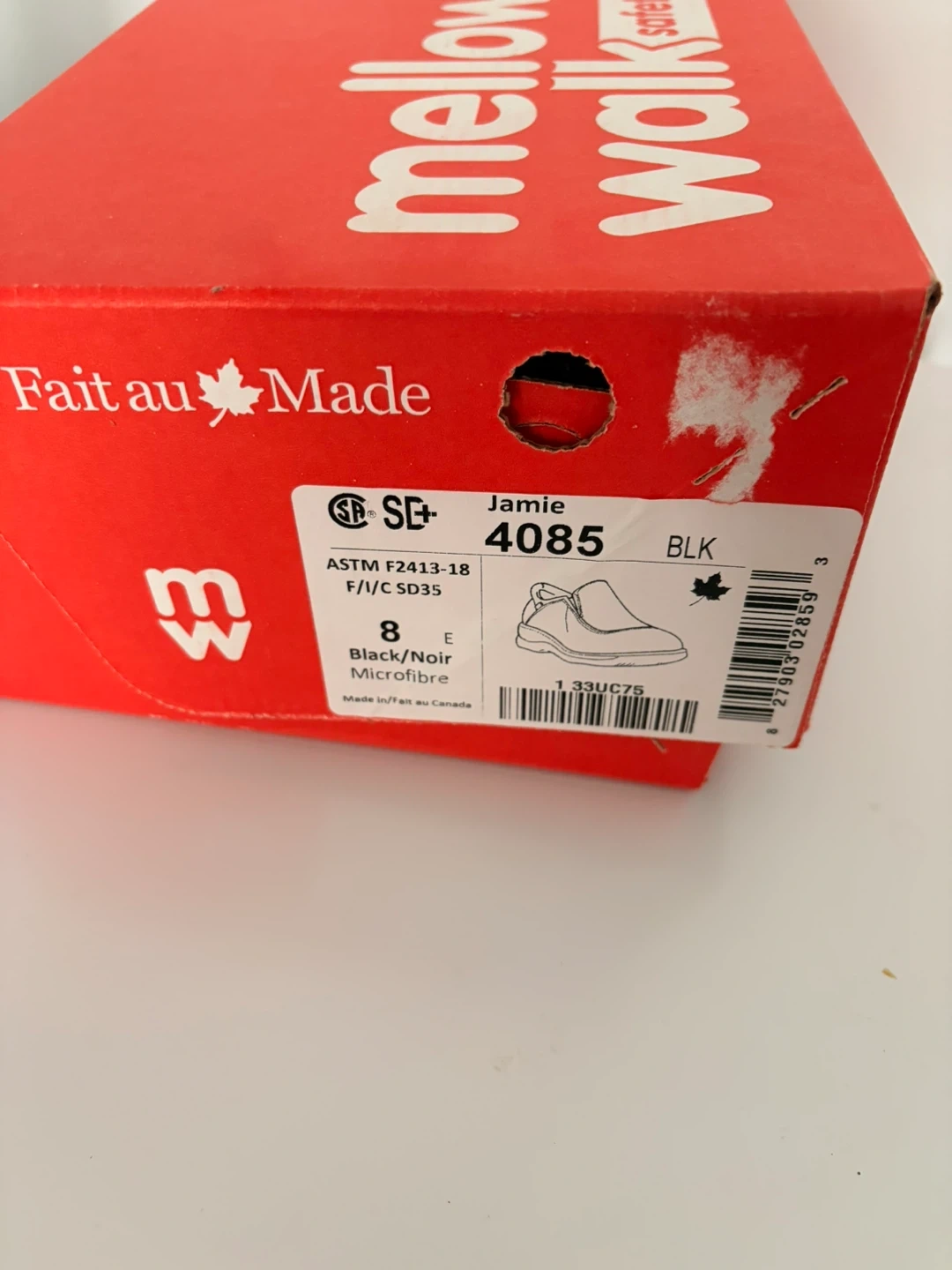 Chaussures de sécurité noires Mellow Walk, modèle Jamie. Semelle antidérapante, confortable et absorbant les chocs. Idéales pour le travail.