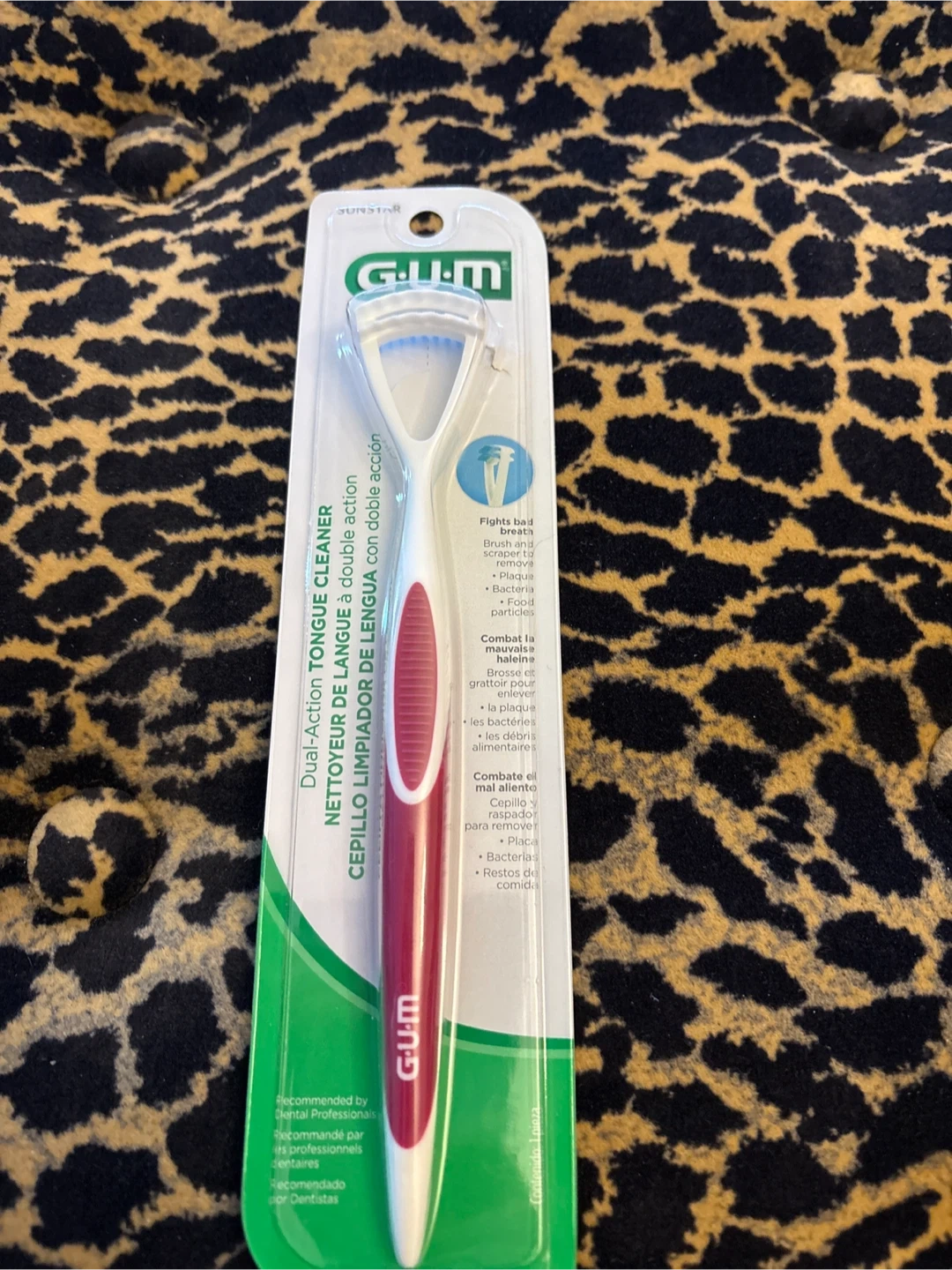 This GUM tongue cleaner fights bad breath with a dual-action brush and scraper. It effectively removes plaque, bacteria, and food particles. It's recommended by dental professionals.