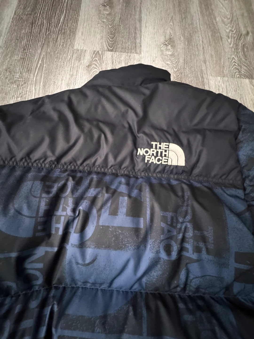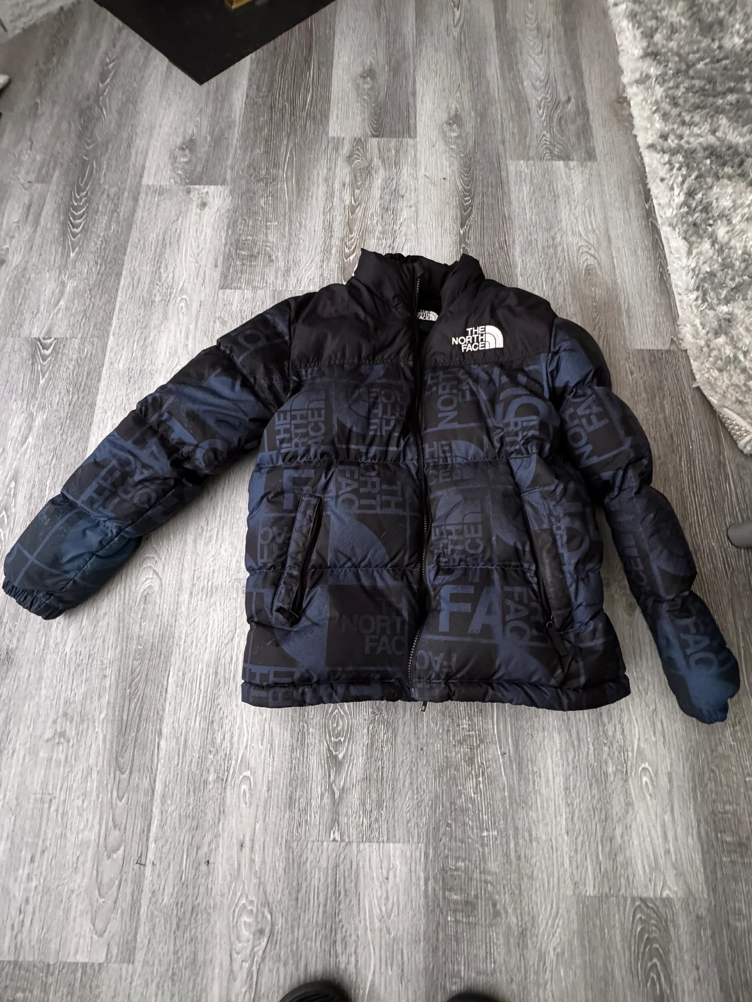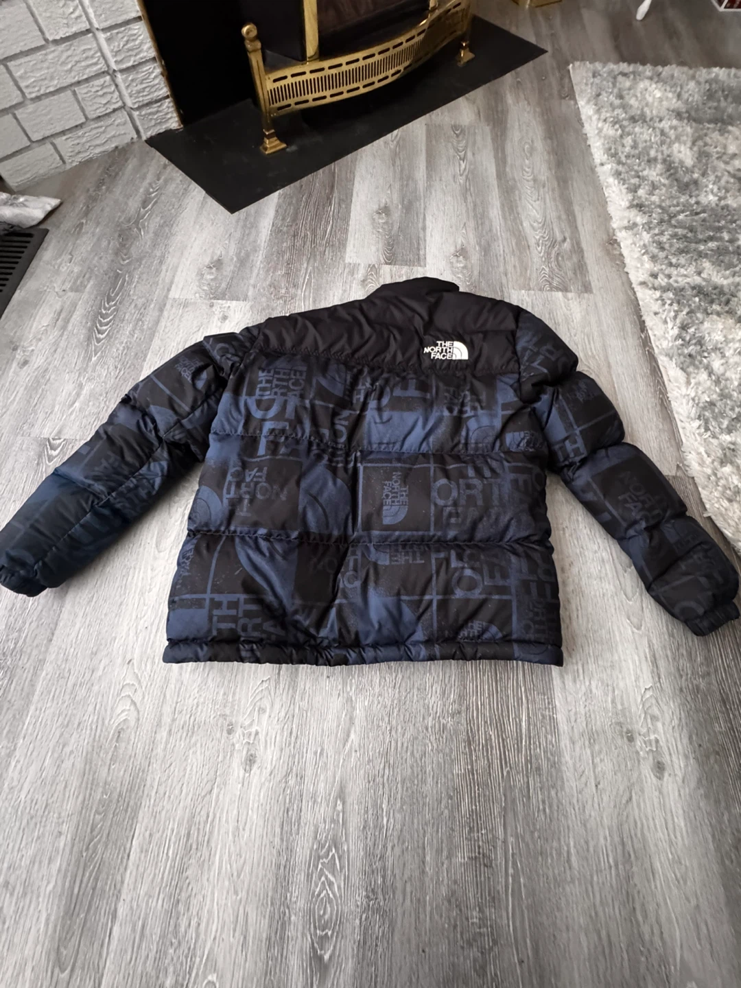 The North Face puffer jacket in teen unisex size XXL. It features a stylish black and blue design with the brand's logo prominently displayed. Perfect for staying warm and cozy during the colder months!