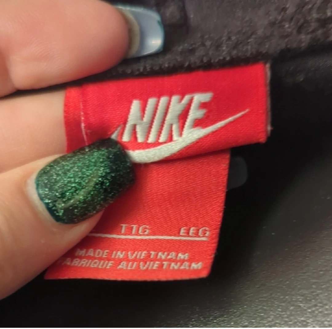This is a black Nike hoodie. It features a full zip and a contrasting red and white stripe detail on the zipper. The left sleeve has the "JUST DO IT." slogan printed on it. It's made in Vietnam and labelled size XXG.