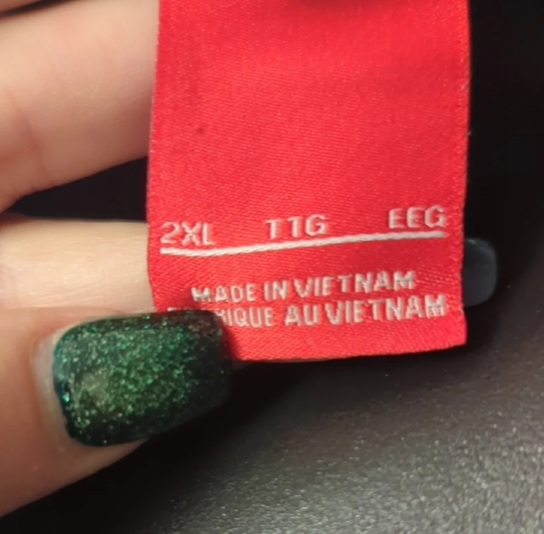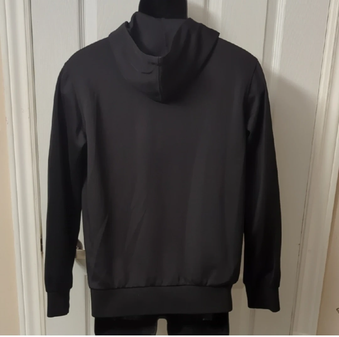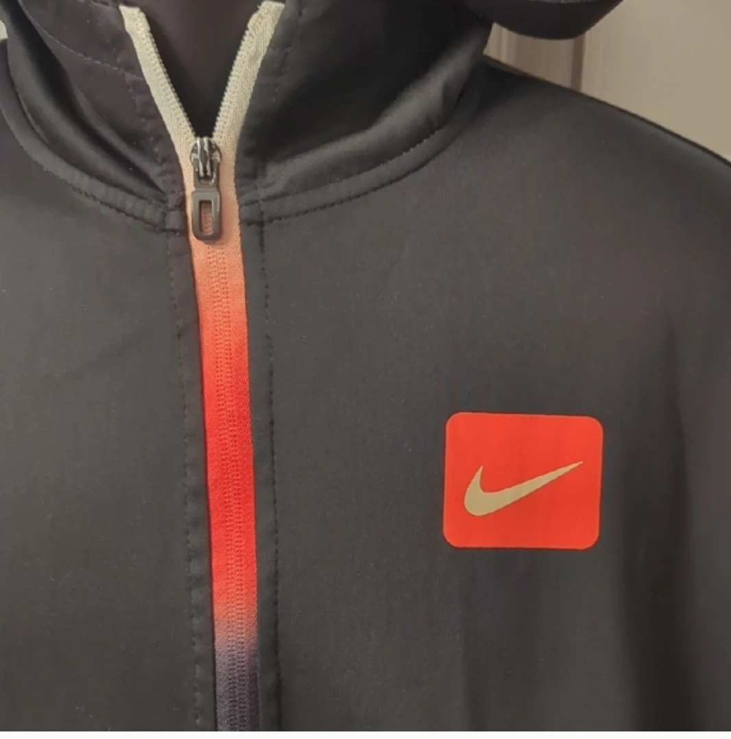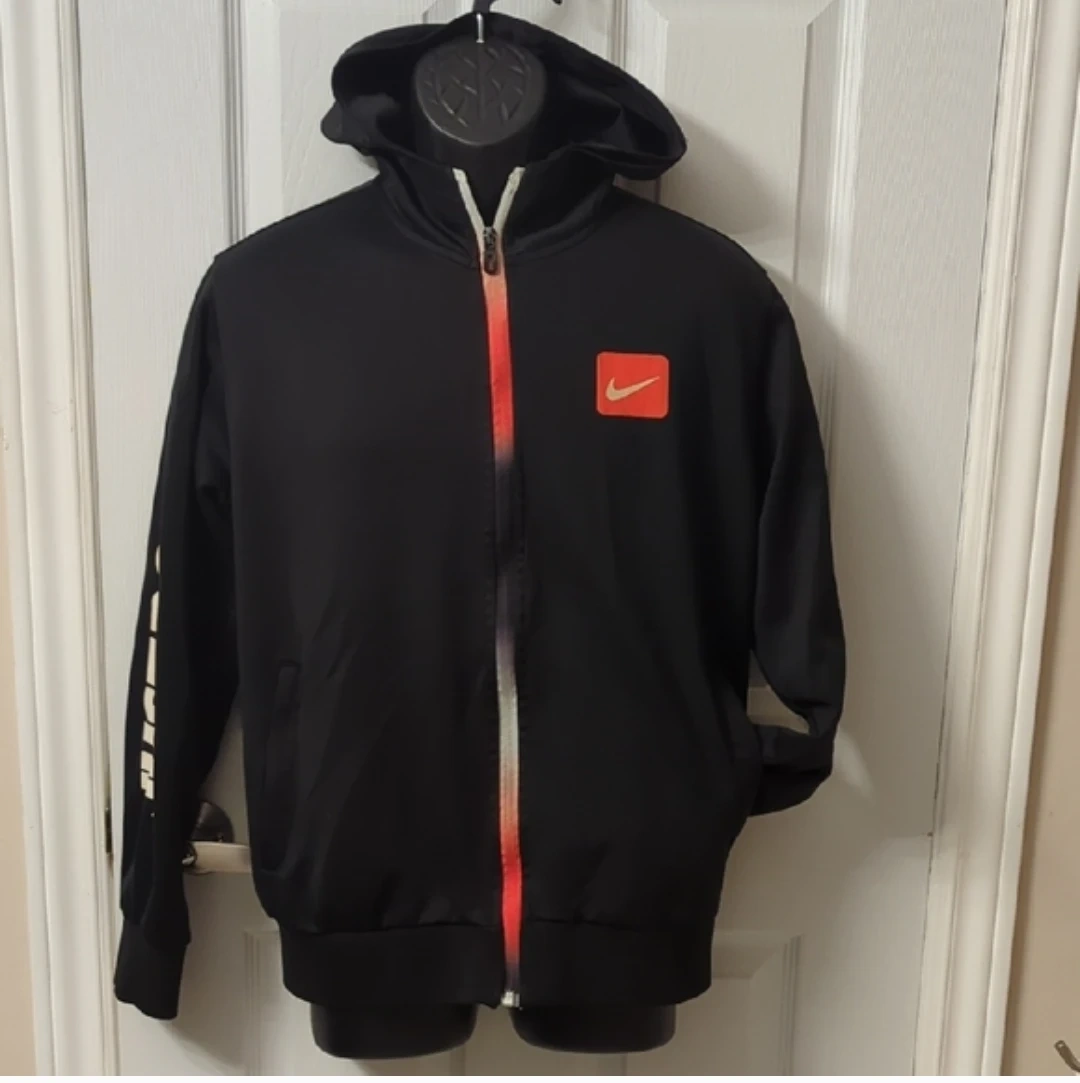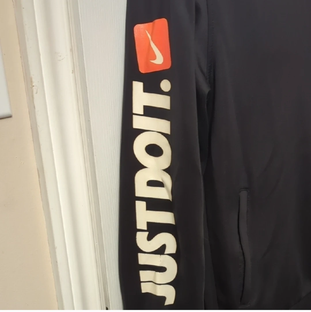 This is a black Nike hoodie. It features a full zip and a contrasting red and white stripe detail on the zipper. The left sleeve has the "JUST DO IT." slogan printed on it. It's made in Vietnam and labelled size XXG.