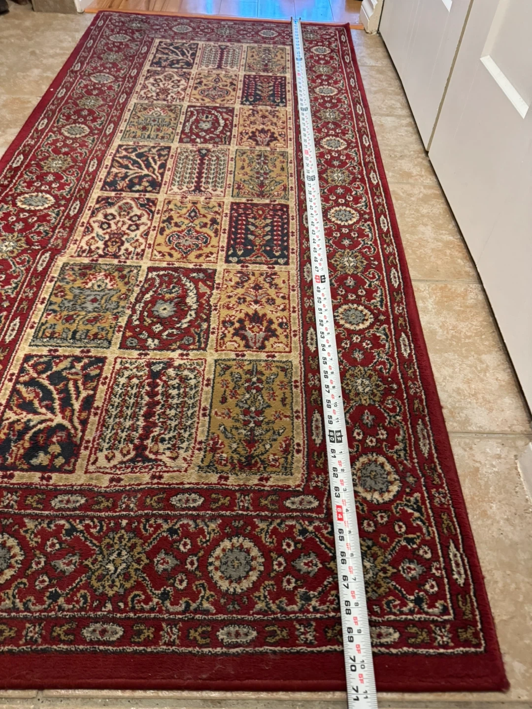 2 Red runner rugs in very good condition with a traditional Persian-inspired pattern. Features a central panel with alternating square motifs in cream, navy, and gold. Dimensions: approximately 2.5 ft wide by 6 ft long. Adds a warm touch to hallways or entryways!