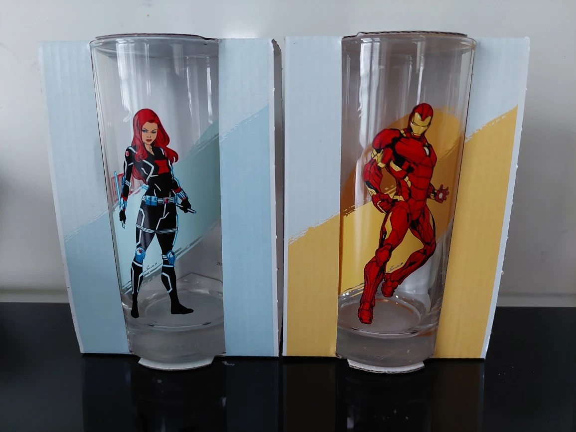 This set includes two Marvel collectible drinking glasses featuring Black Widow and Iron Man. Each glass holds 290 ml. Brand new in original boxes.