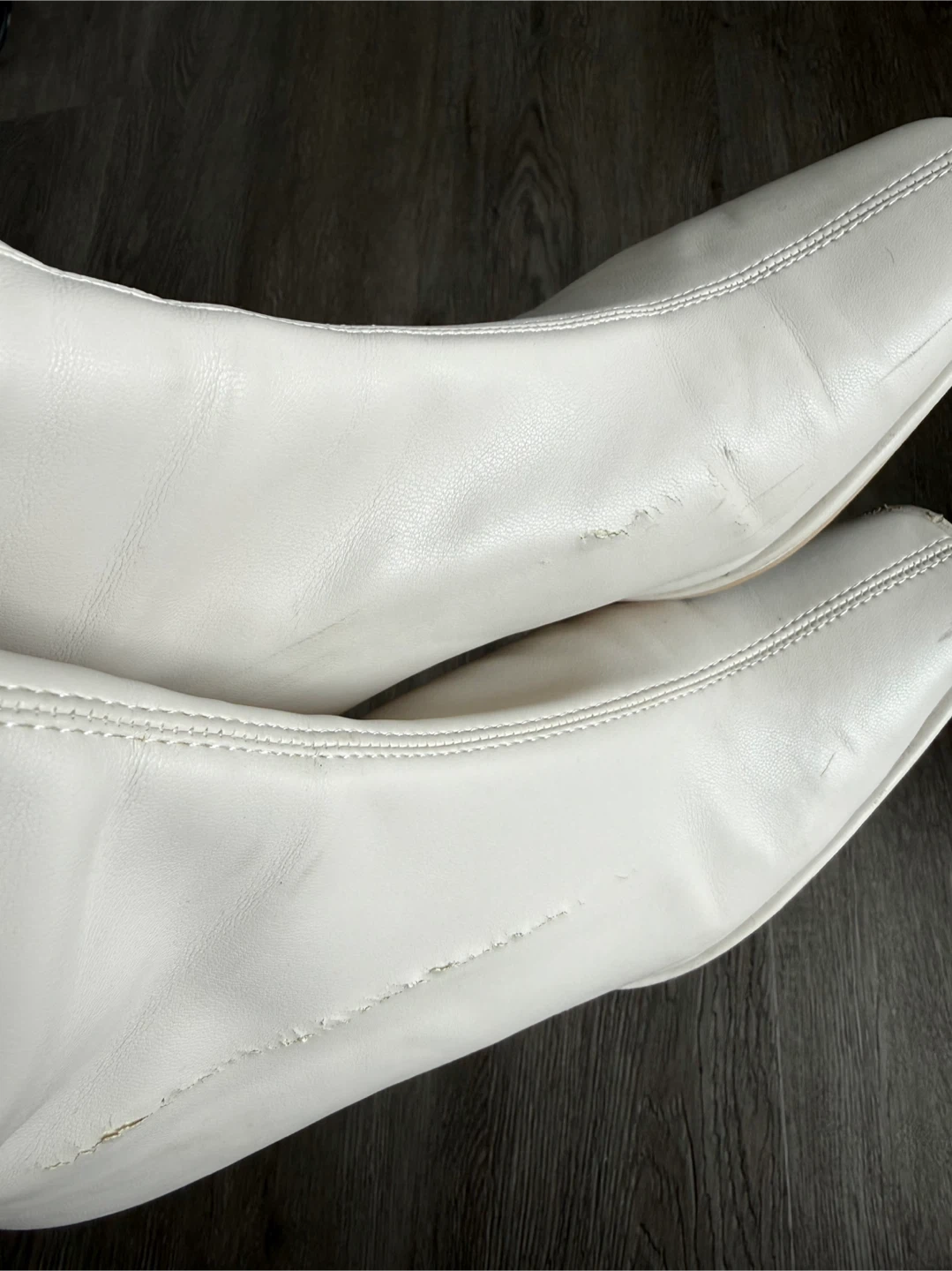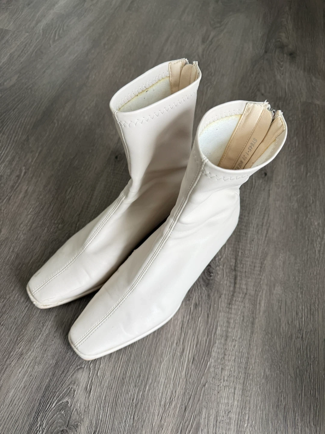 White ankle boots with a square toe and zip closure. They're made of a synthetic material and have a low heel.