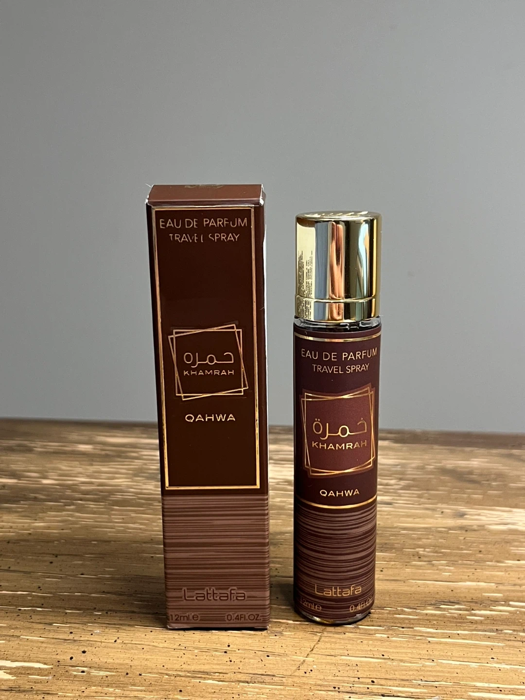 This is a Lattafa Khamrah Qahwa Eau de Parfum travel spray. It's 12ml (0.4 fl. oz.) in size. The fragrance comes in a convenient spray bottle, perfect for on-the-go use.