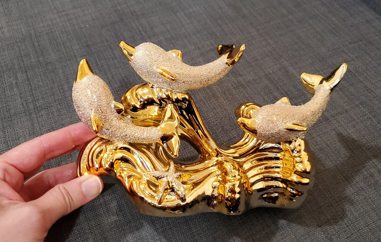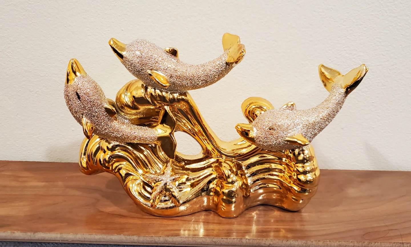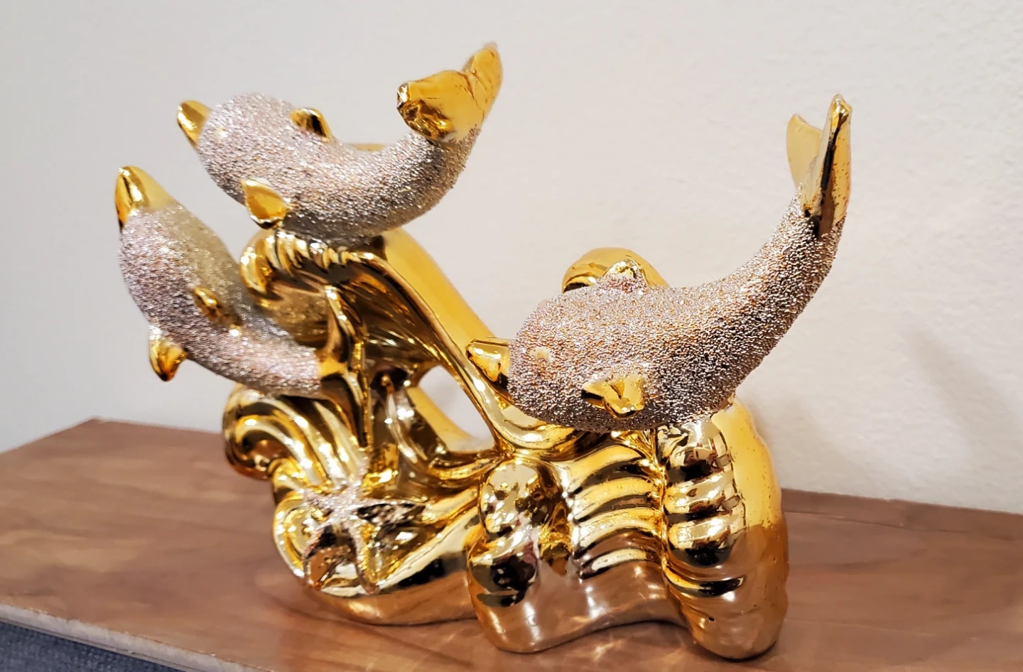 Shiny gold ceramic figurine featuring three dolphins leaping over waves. It has a sparkling glitter finish on the dolphins. This decorative piece adds a touch of ocean elegance to any space.