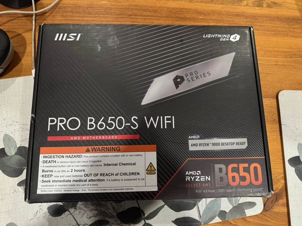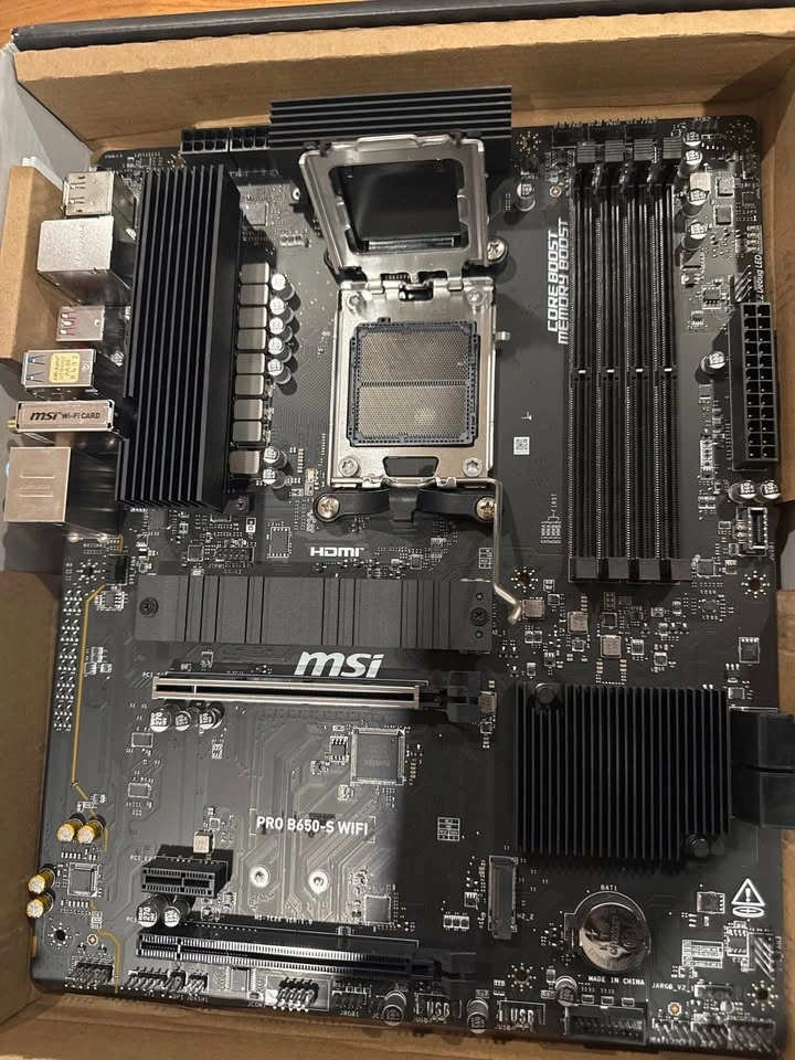 Selling an MSI PRO B650-S WIFI motherboard for the AM5 platform. Supports AMD Ryzen 7000 / 8000 / 9000 series, DDR5, and has built-in WiFi. The CPU socket has bent pins, so the board is untested and sold as-is. No other visible damage. This board may be repairable if you have experience straightening pins, or can be used for parts. Includes the original box and motherboard. No CPU or RAM included.