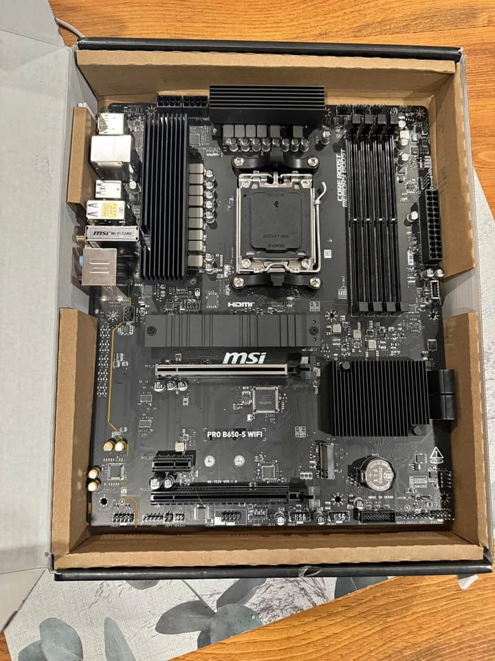 Selling an MSI PRO B650-S WIFI motherboard for the AM5 platform. Supports AMD Ryzen 7000 / 8000 / 9000 series, DDR5, and has built-in WiFi. The CPU socket has bent pins, so the board is untested and sold as-is. No other visible damage. This board may be repairable if you have experience straightening pins, or can be used for parts. Includes the original box and motherboard. No CPU or RAM included.