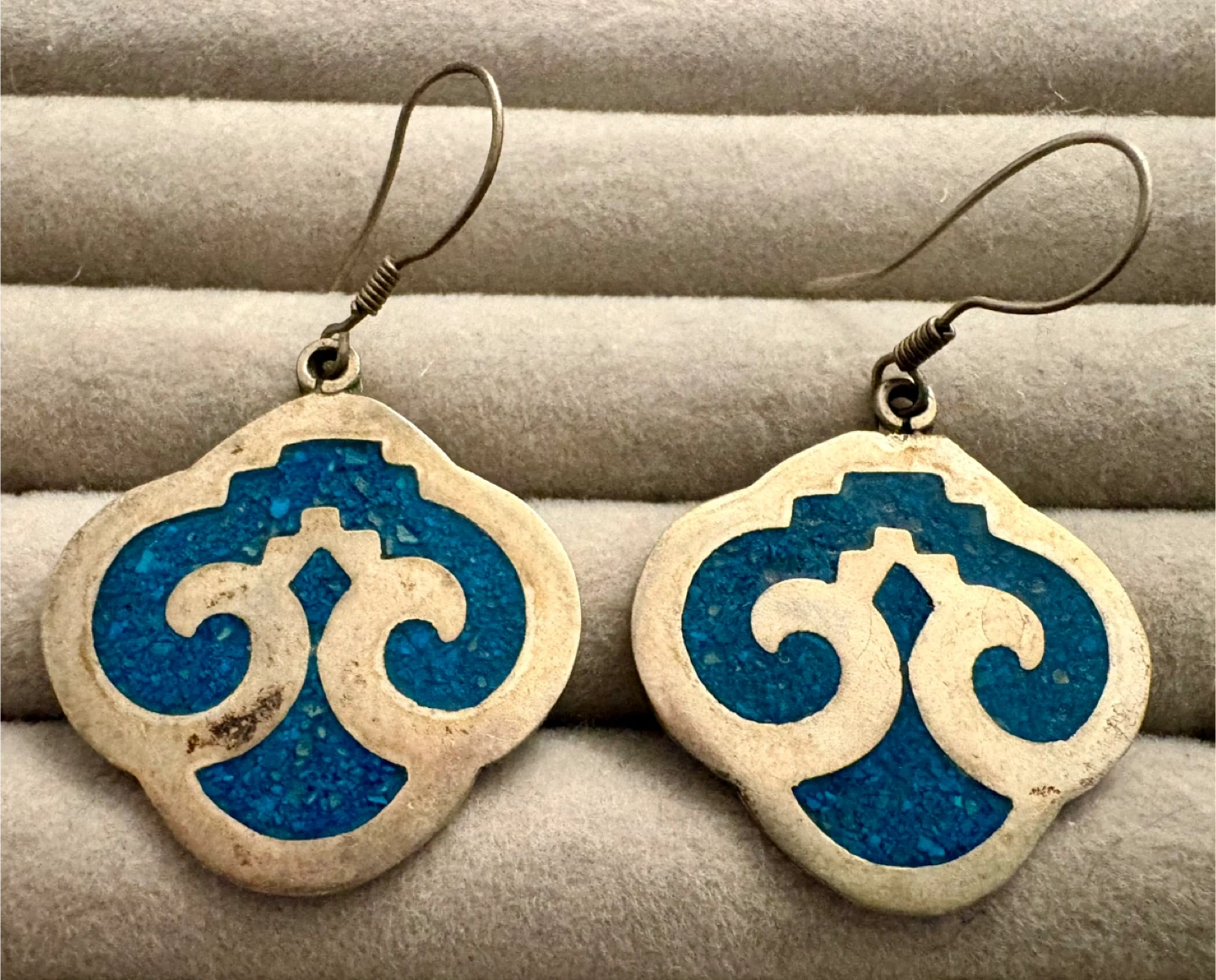 A diverse collection of earrings featuring gold-toned, silver-toned, and mixed-material designs. Styles include hoops, studs, dangles, and geometric shapes. Includes intricate mosaic and inlay details.