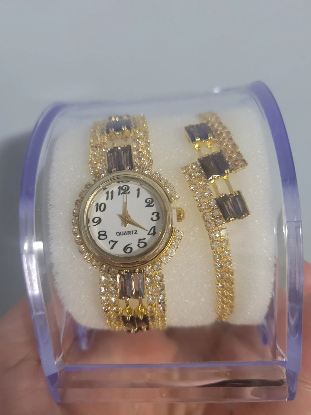 Elegant women's watch with a dazzling rhinestone band. Features a white dial with clear hour markers and gold-tone hands. This set includes a matching bracelet, perfect for adding some sparkle to your outfit! Watch is quartz operated.