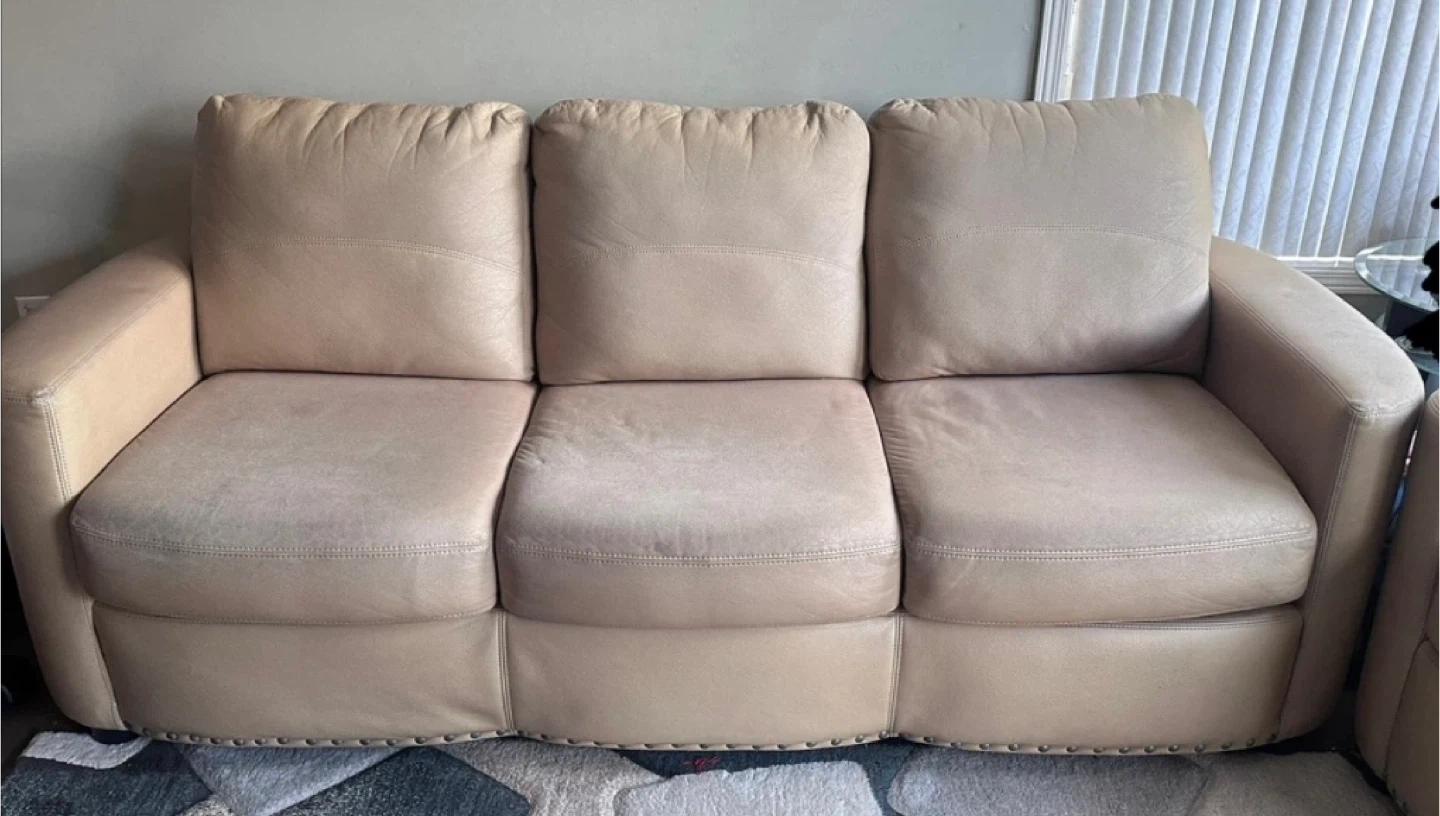 This is a comfortable 5 piece leather sofa set, including a three-seater couch, and love seat. It has a sturdy frame with decorative nailhead trim.