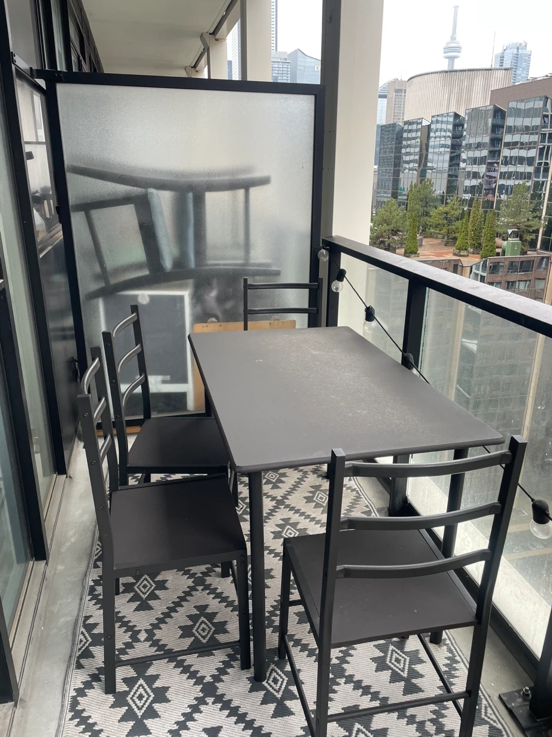 This black dining table set includes a table and four chairs. Perfect for enjoying meals or drinks and can be used indoors and outdoors!