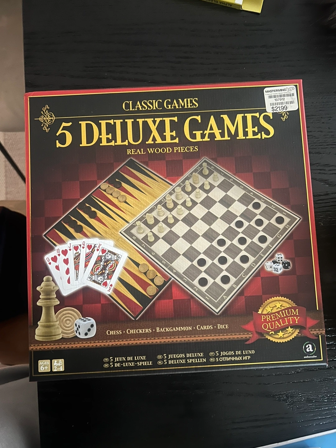 Set of 5 classic games, including chess, checkers, backgammon, cards and dice. Made with real wood pieces.