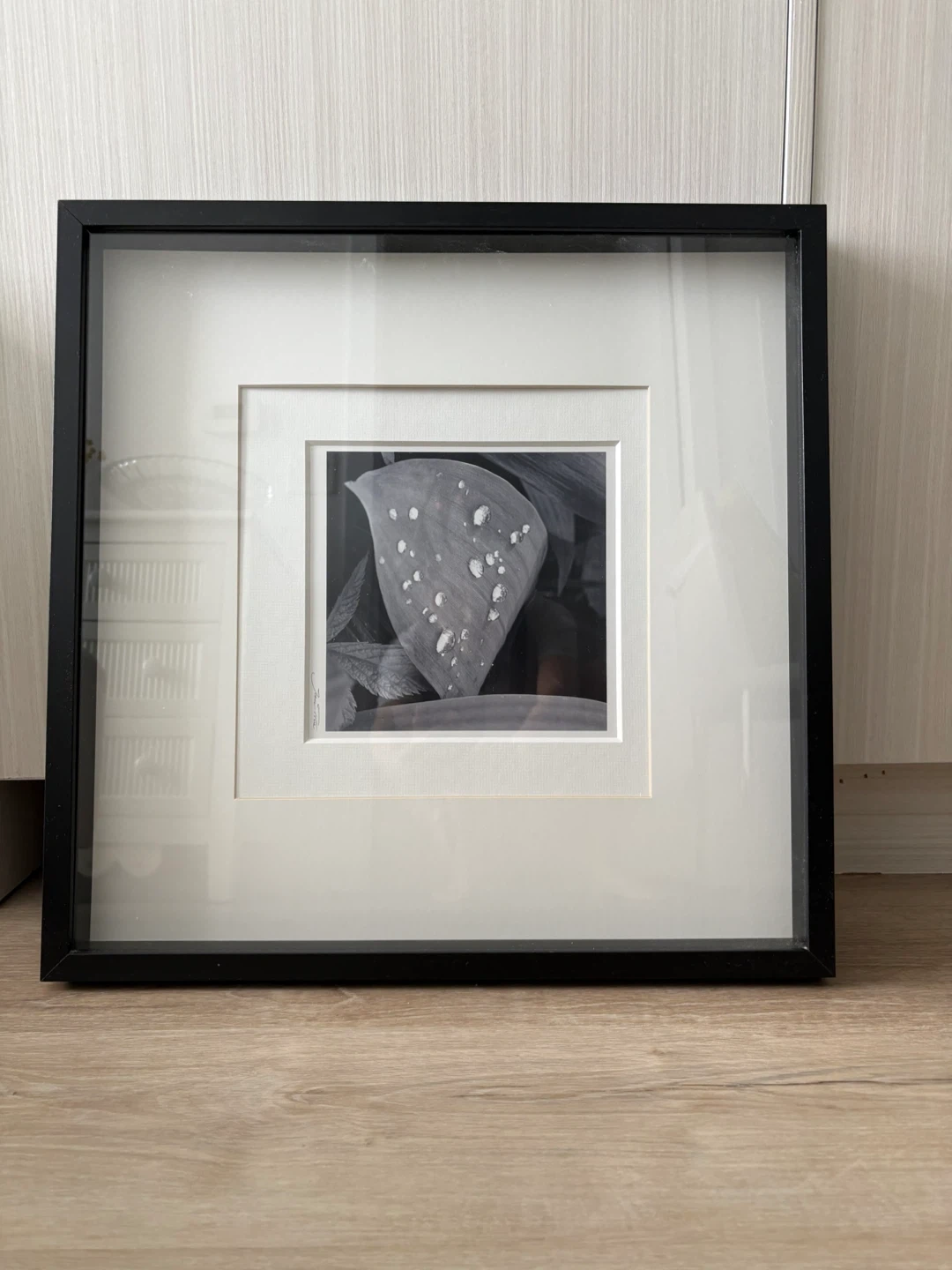 A framed print featuring a leaf design. The print is in black and white, set within a white mat and a sleek black frame. It's a lovely piece to add a touch of nature to your wall decor