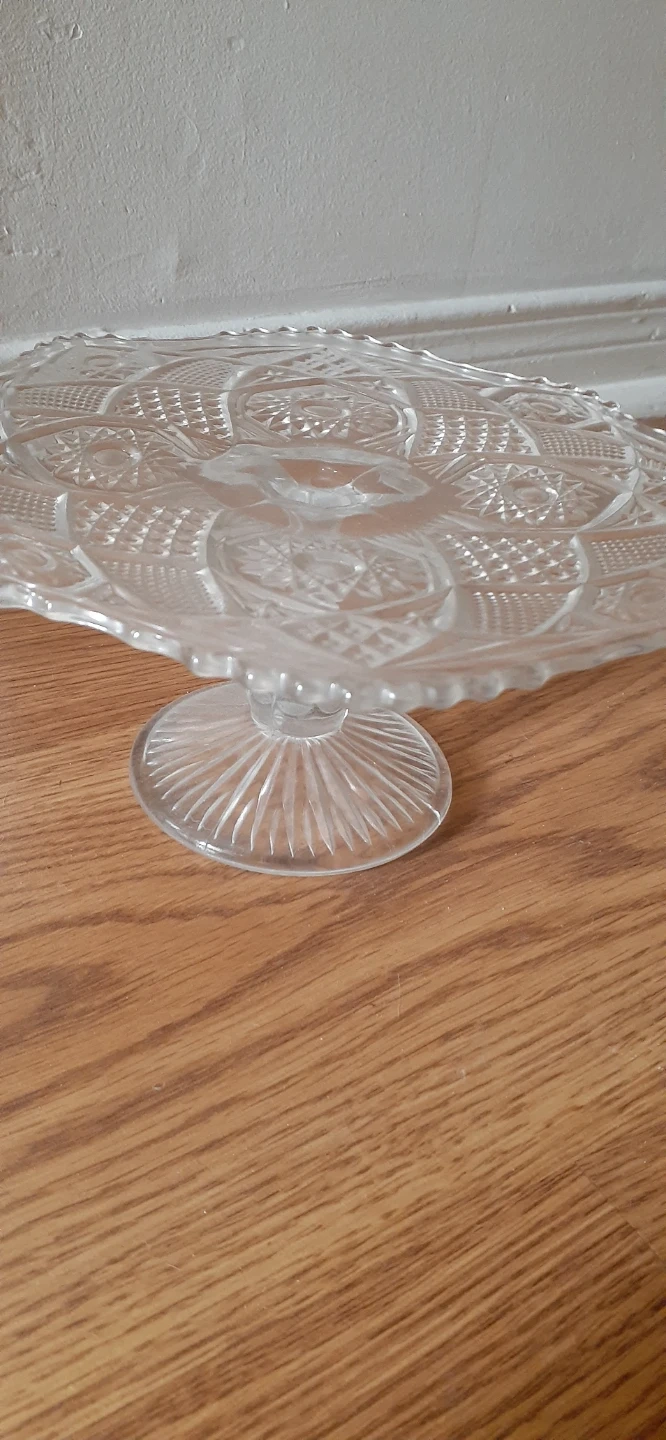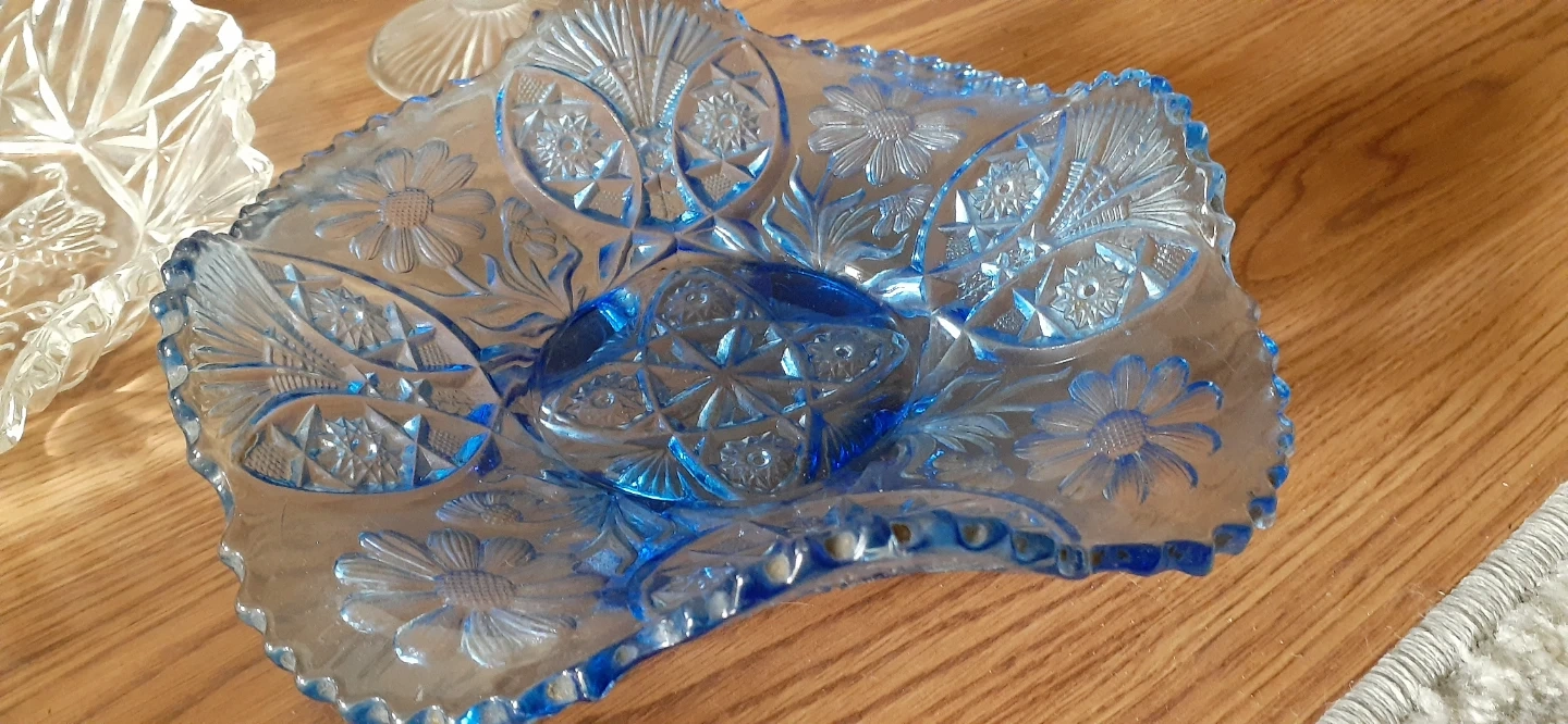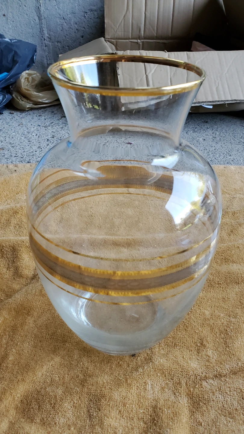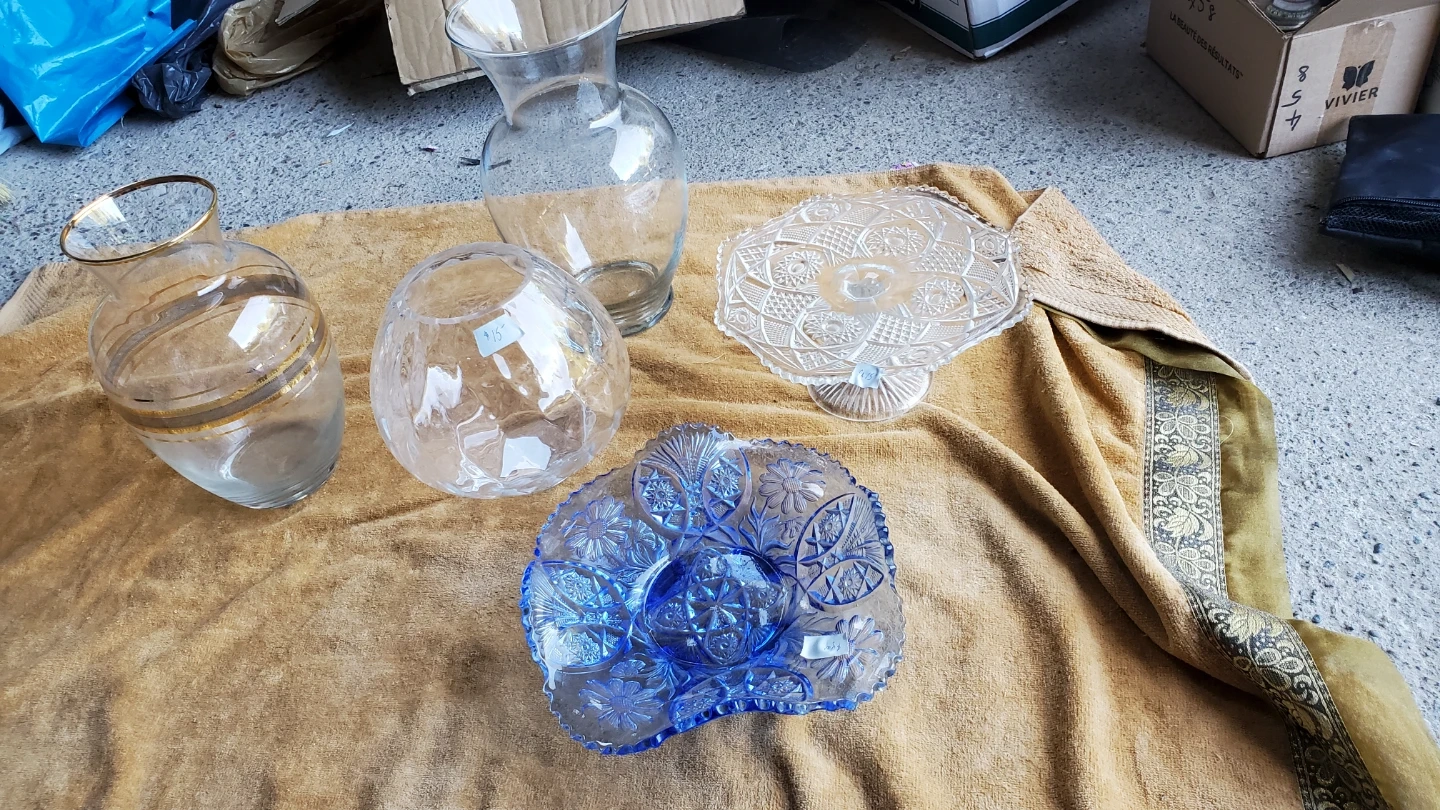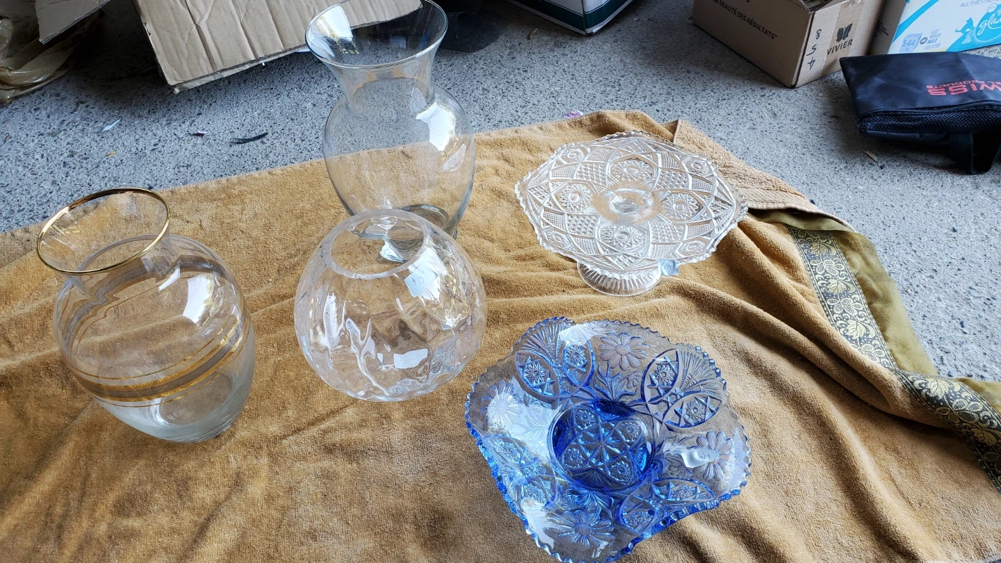 Collection of clear glass vases and decorative bowls. Includes one vase with gold stripes, a textured clear glass globe vase, a blue glass patterned bowl, and a clear glass footed cake stand. These pieces add a touch of elegance to your table.