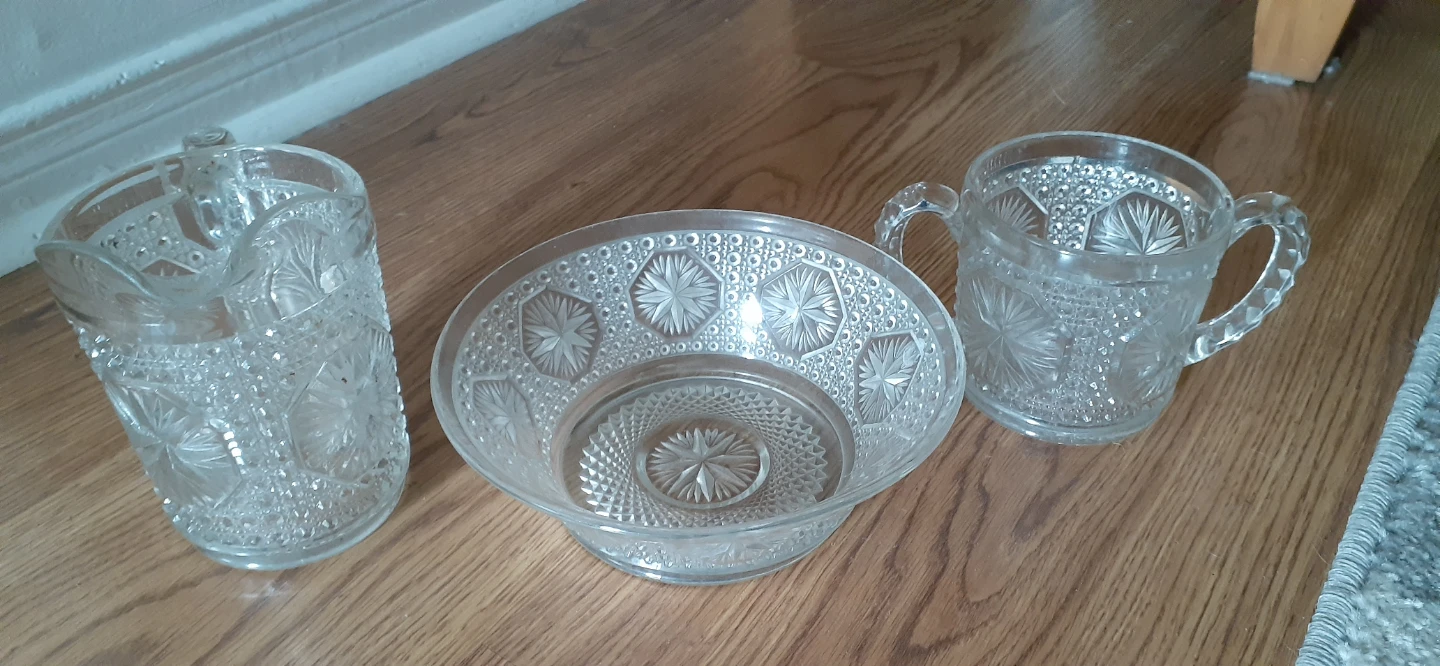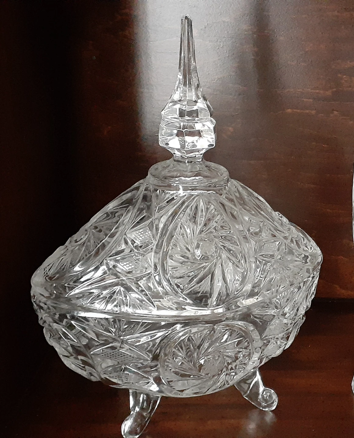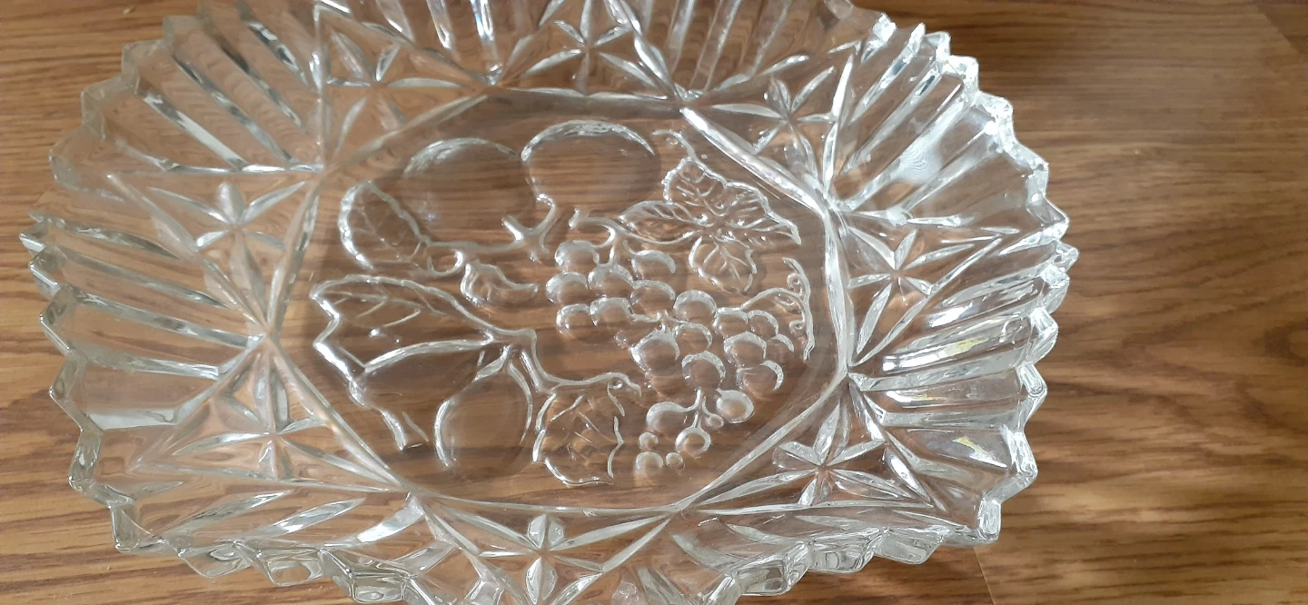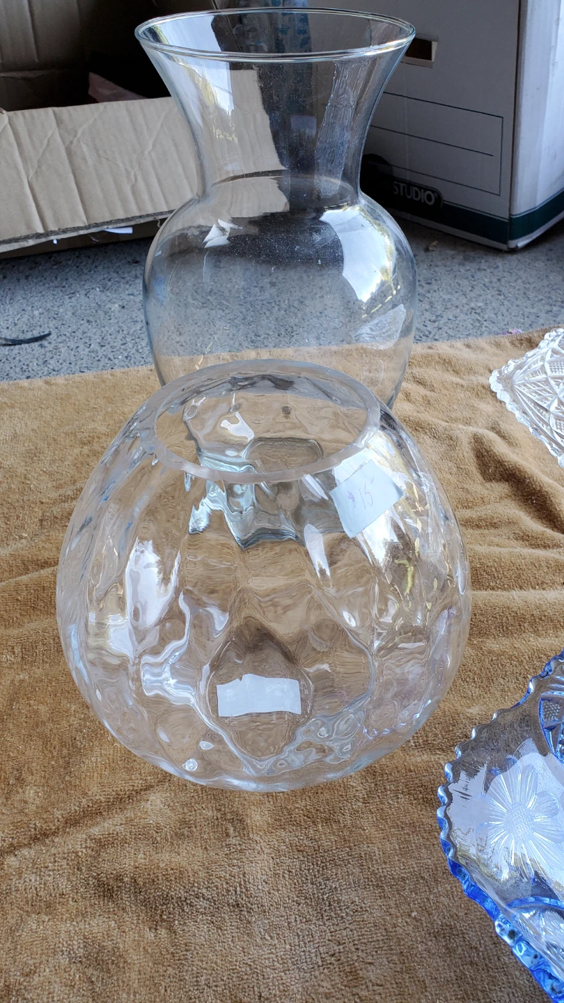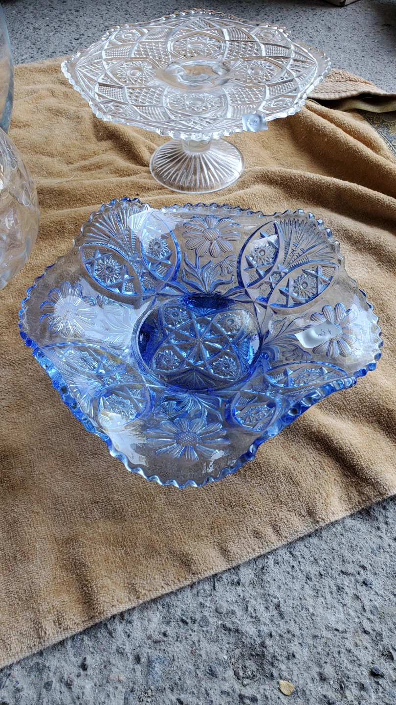 Collection of clear glass vases and decorative bowls. Includes one vase with gold stripes, a textured clear glass globe vase, a blue glass patterned bowl, and a clear glass footed cake stand. These pieces add a touch of elegance to your table.