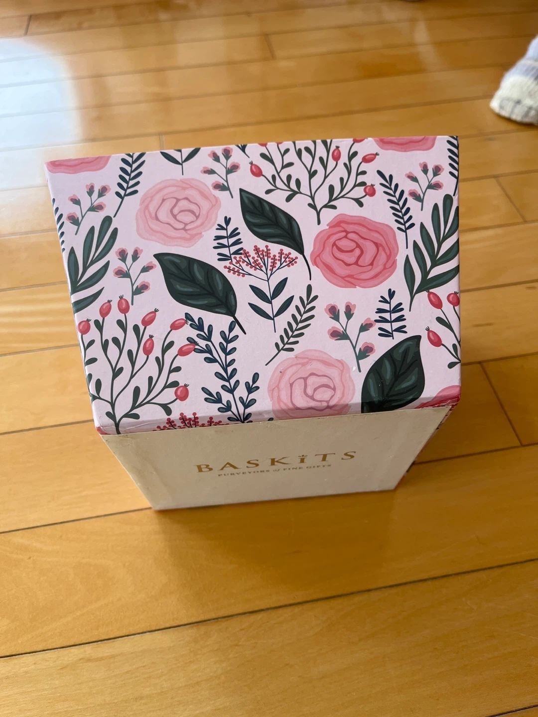 This is a cute floral storage box from Baskits. It's perfect for organizing small items. Measures approximately 6 inches by 6 inches by 6 inches. It is slightly stained in the inside.