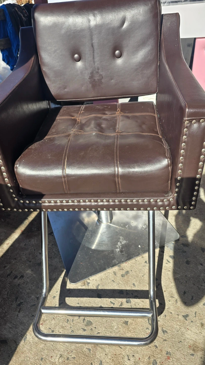 This is a sturdy salon chair upholstered in brown faux leather. It features a metal base and footrest. The chair has a tufted seat and backrest, accented with decorative nailhead trim. It's ideal for a salon or barber shop.