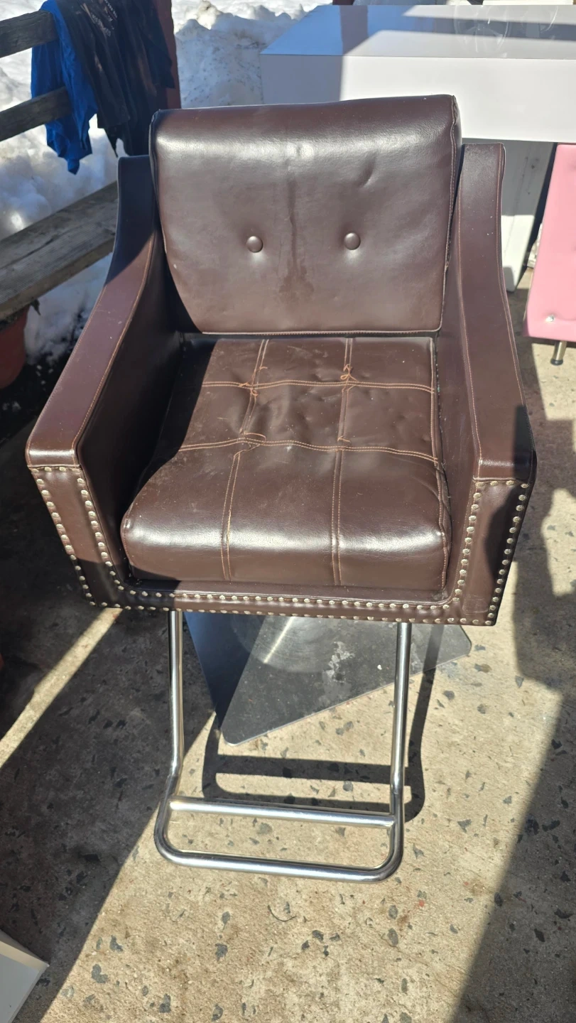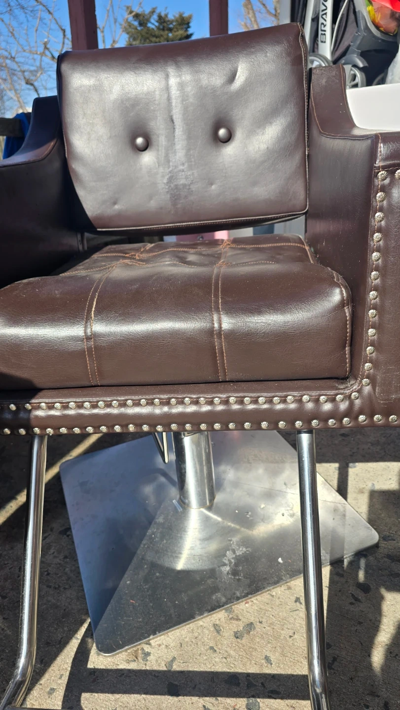 This is a sturdy salon chair upholstered in brown faux leather. It features a metal base and footrest. The chair has a tufted seat and backrest, accented with decorative nailhead trim. It's ideal for a salon or barber shop.
