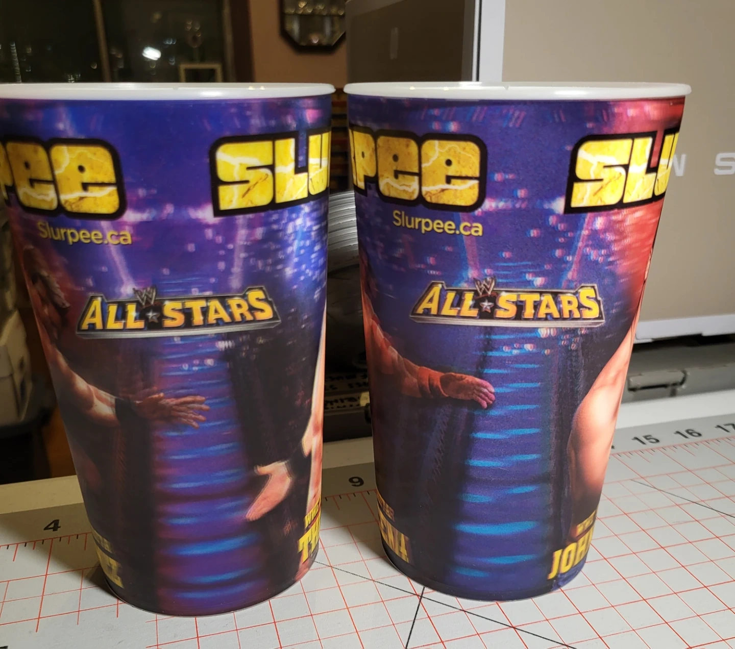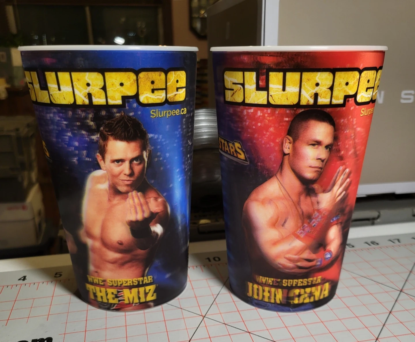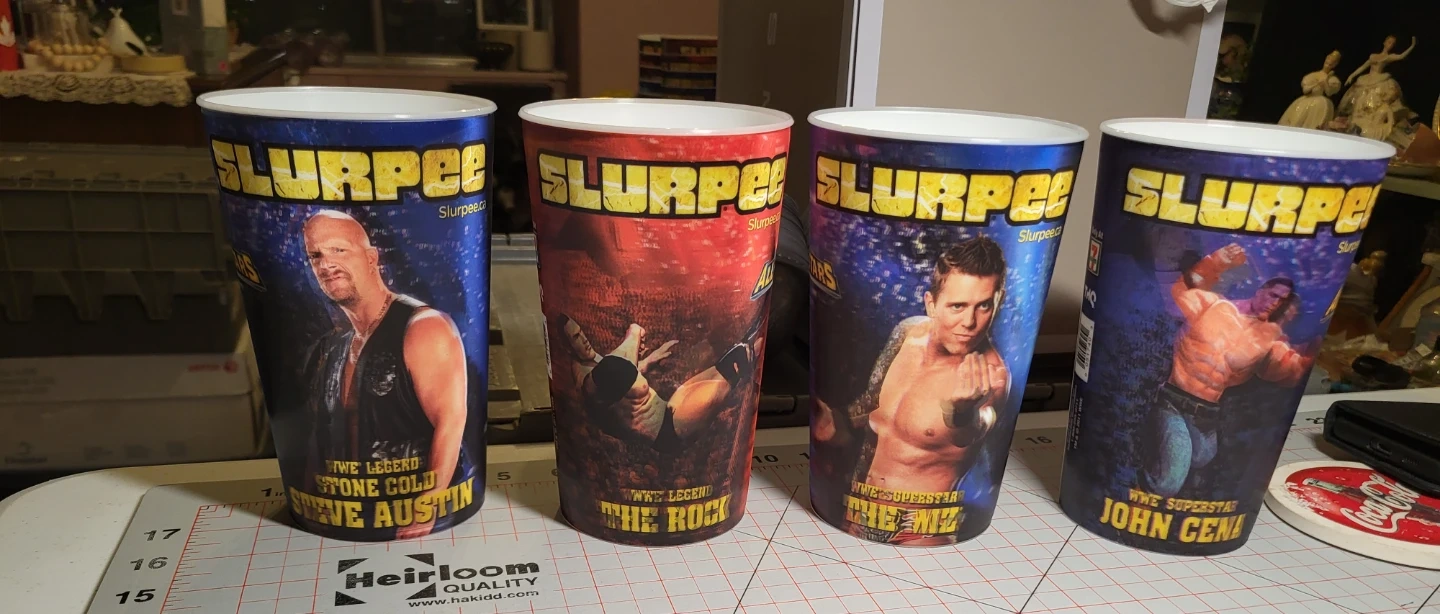 70Selling a set of four Slurpee cups featuring WWE All-Stars! Each cup has a different wrestler: Stone Cold Steve Austin, The Rock, The Miz, and John Cena. Great for any wrestling fan or collector! Cash only please. Thanks.