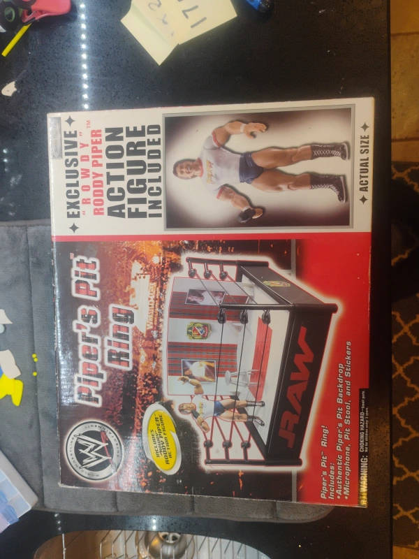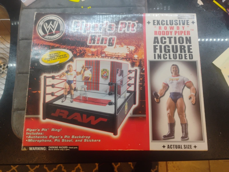 104Selling a WWE Piper's Pit Ring, complete with an exclusive “Rowdy” Roddy Piper action figure! The box includes the authentic Piper's Pit backdrop, microphone, pit stool, and stickers. A great addition for any wrestling fan or collector!