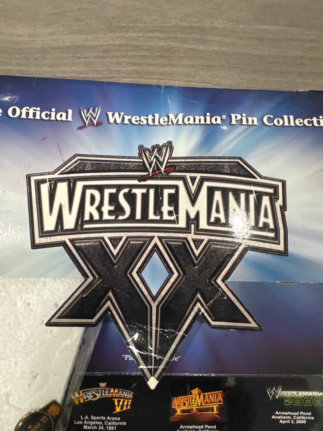 54Selling a complete set of The Official WWE WrestleMania Pin Collection. This collection commemorates the 20th anniversary of sports entertainment's premier event. Perfect for any wrestling fan! Found in storage package is unopened all pins present