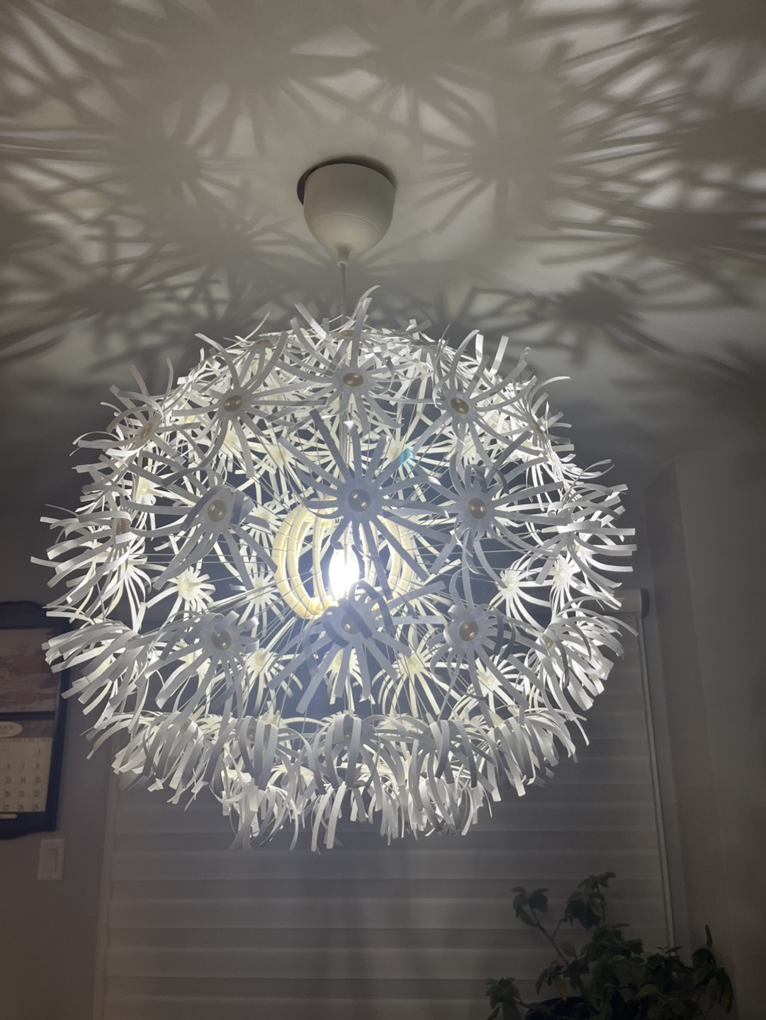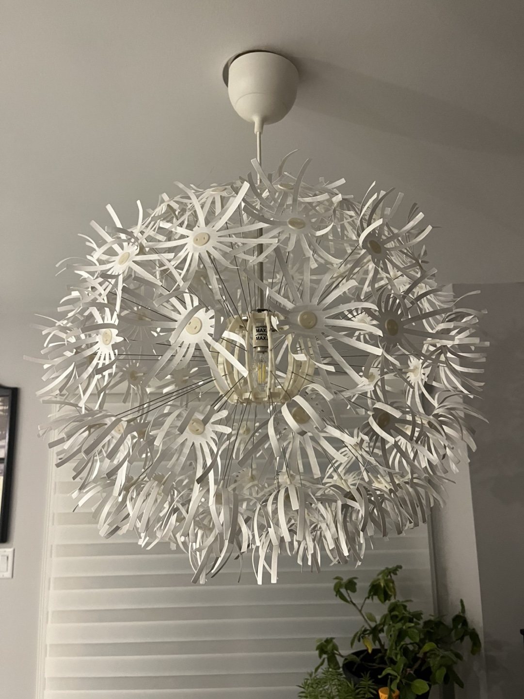 Unique spherical pendant lamp. White paper design. Creates interesting shadows. Great statement piece for any room. Only takes one small bulb (bulb included) so suitable for a room that doesn’t need a lot of light. No longer available in stores. Fastest pick up please.