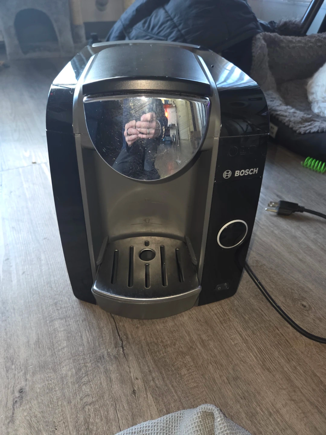 This appliance is a single-serve coffee maker that uses barcoded coffee pods, known as T DISCs, to prepare a variety of hot beverages.