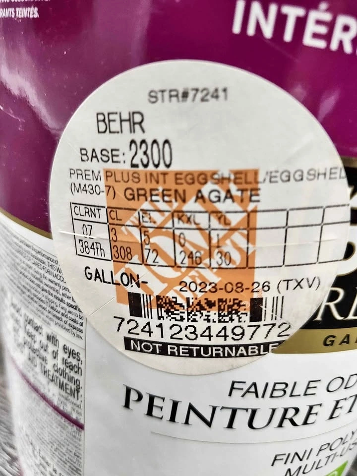 Brand new, unused Behr Premium Plus paint in Eggshell finish, Agate Green color. We changed our minds on the color for our project and couldn't return it to Home Depot. Feel free to message if you have any questions!