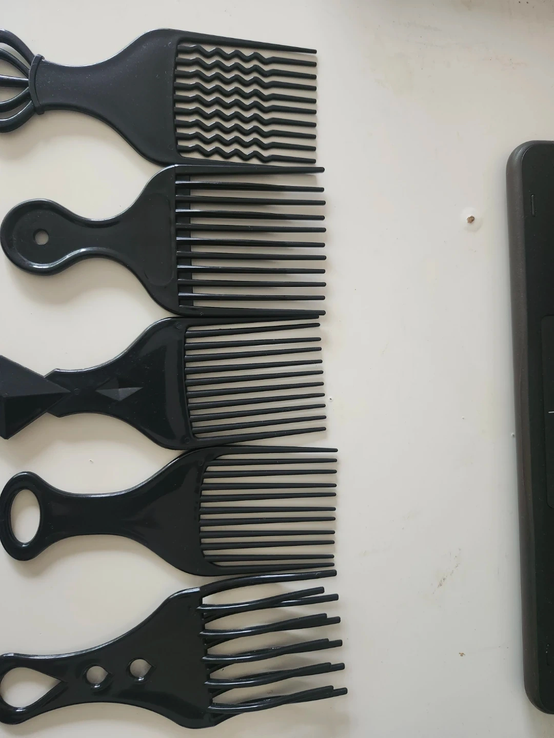 This is a set of five black plastic afro combs. They come in various designs to help style and lift textured hair. Includes a comb with wavy teeth, one with wide teeth, and others with finer teeth. Plastic material.